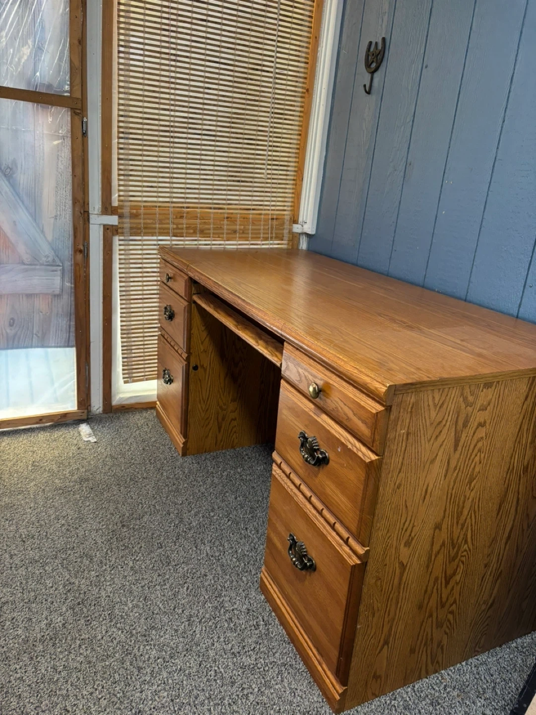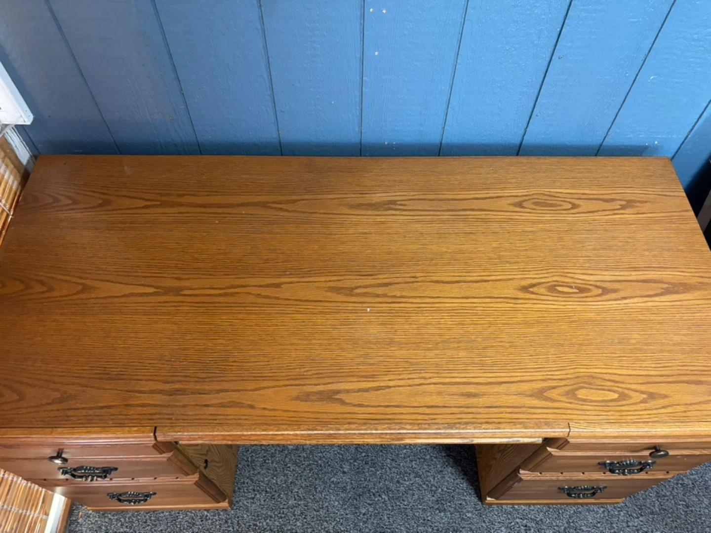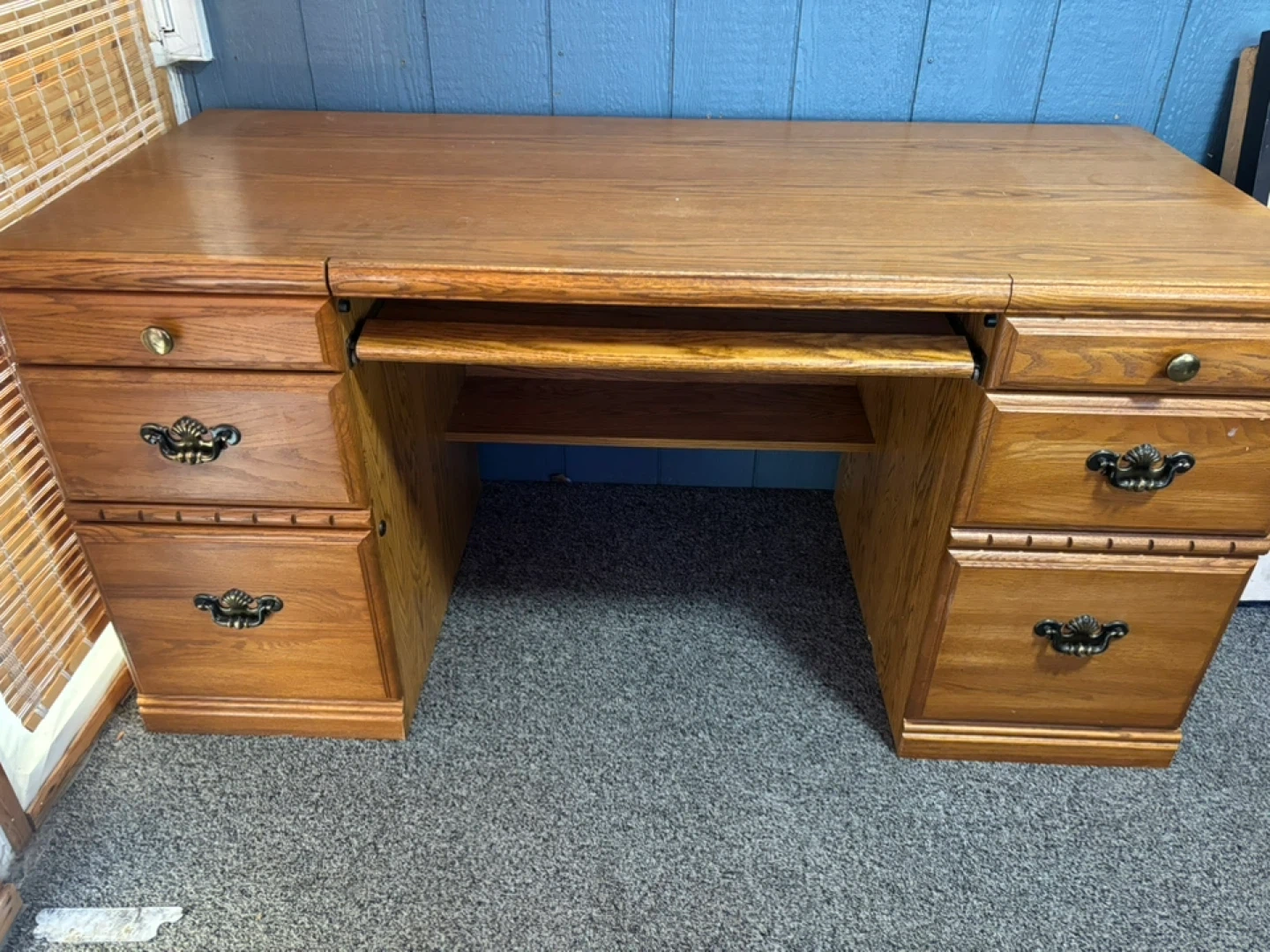 10Here's a classic wooden desk, perfect for a home office or study space! It features several drawers for storage and a pull-out keyboard tray. The desk measures approximately 30 inches in height and 48 inches in width. It has a warm, oak-like finish.