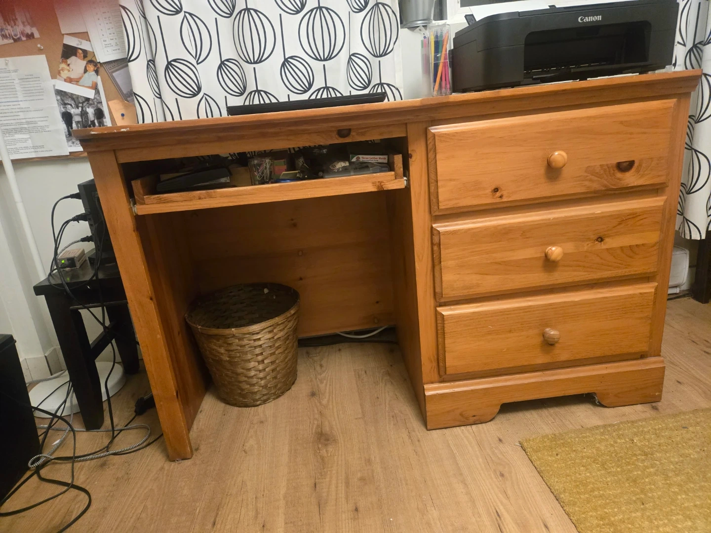 37Selling a wooden desk with multiple drawers. It's in good condition and perfect for a home office or study space. The desk offers ample storage and a sturdy surface for all your work needs. It has a warm, natural wood finish that would fit into any room!