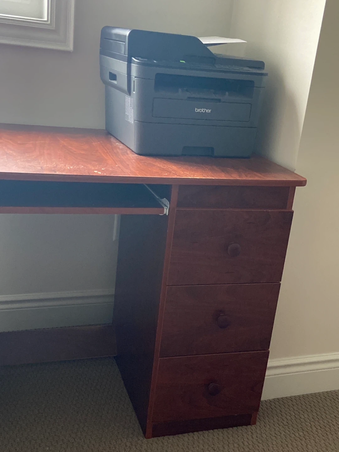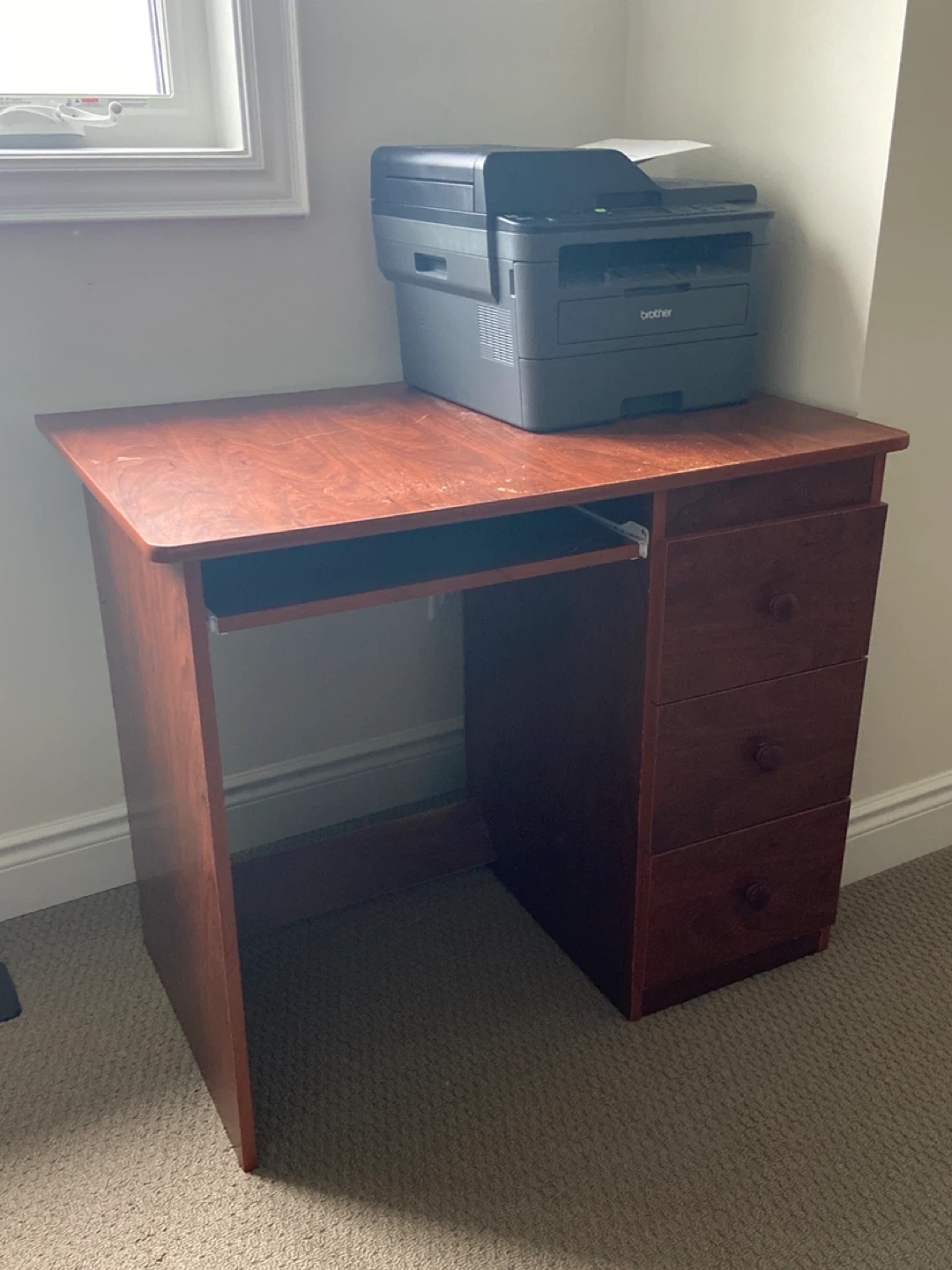 Selling a wooden desk that's perfect for a home office or study space. It features a smooth surface and includes drawers for convenient storage. It's in good condition and ready for a new home
