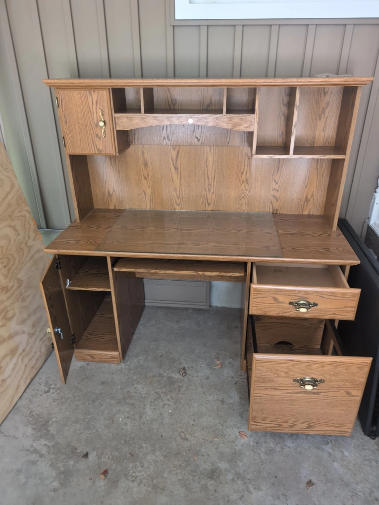 Selling a wooden desk with a hutch. solid oak. It features multiple shelves and drawers for storage. Perfect for a home office or study space. perfect for anyone but students would love this dedk. It's in good condition and ready for a new home!