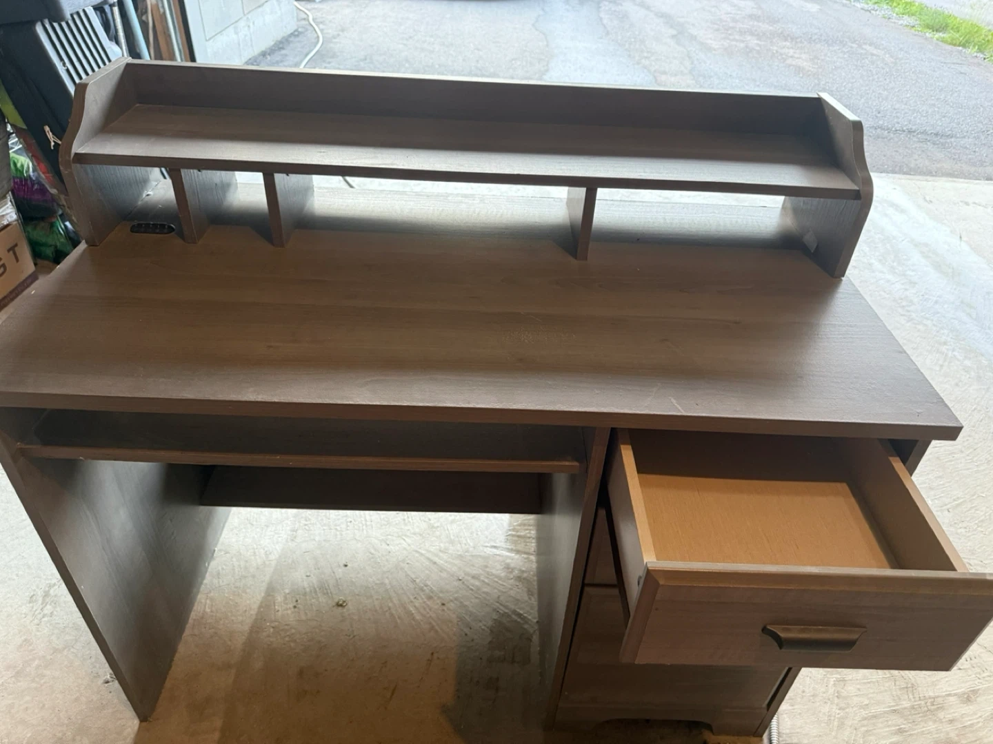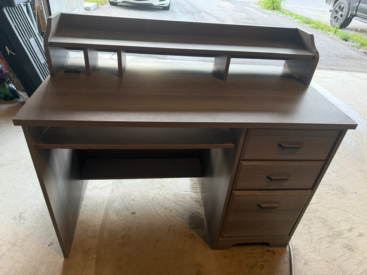 Selling a wooden desk with a hutch in a nice brown colour. It has a built-in shelf and three drawers for storage. Perfect for a home office or study space! The desk is in great condition and ready for a new home