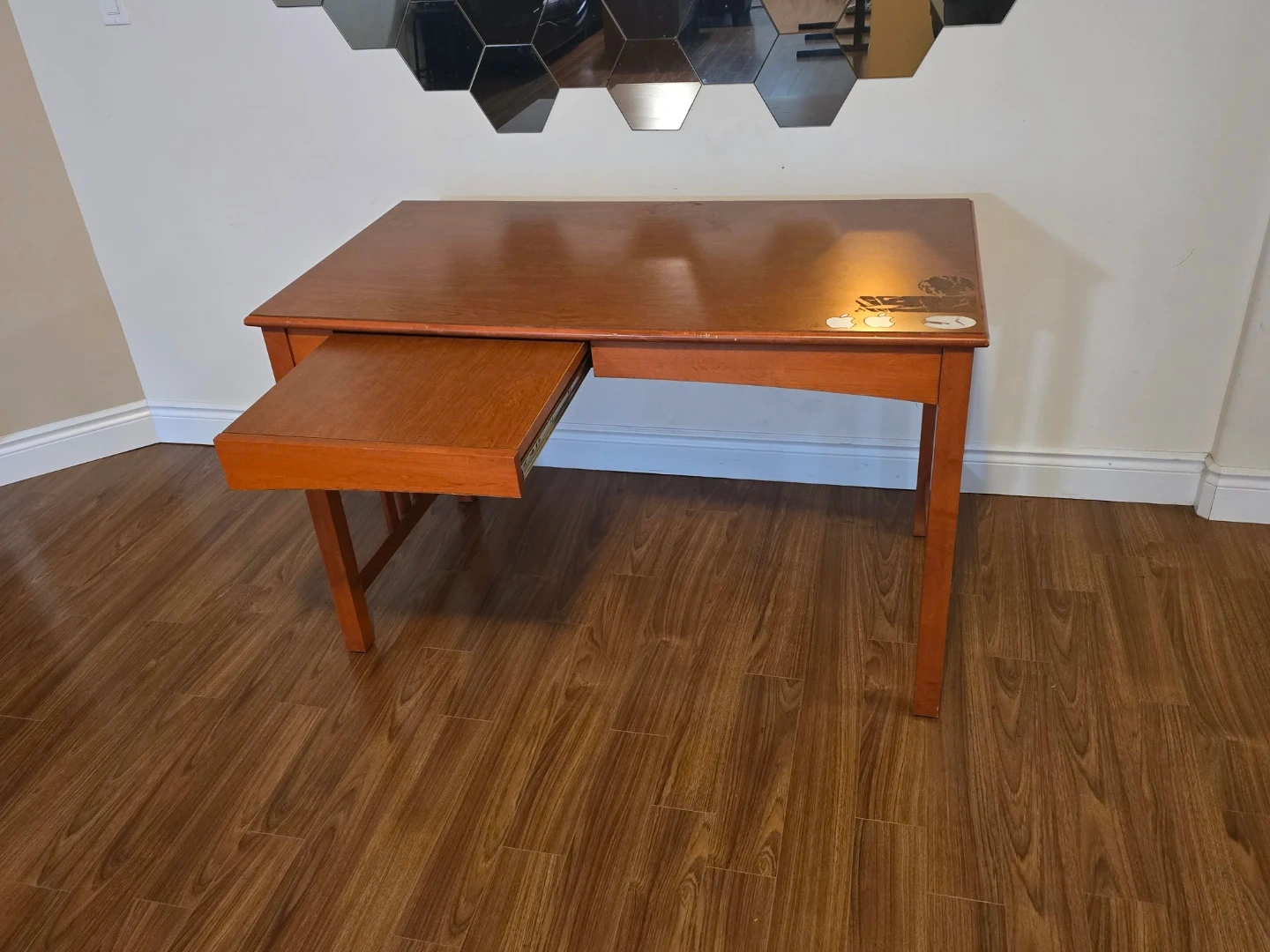 60This is a beautifully crafted solid wood table in excellent condition — perfect for use as a study desk, writing table, or home office workspace. Material: Made of solid hardwood (likely teak or oak veneer on hardwood frame), giving it a warm natural finish and long-lasting durability. Condition: Very sturdy and stable; no wobbling. The surface shows light wear consistent with age but is overall in great shape. Features: Smooth sliding drawer for keyboard or books. Clean mid-century style design Solid legs and frame construction