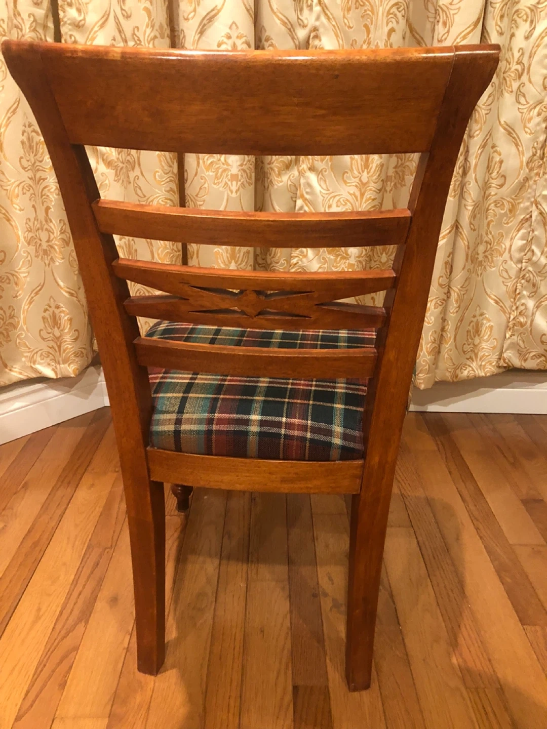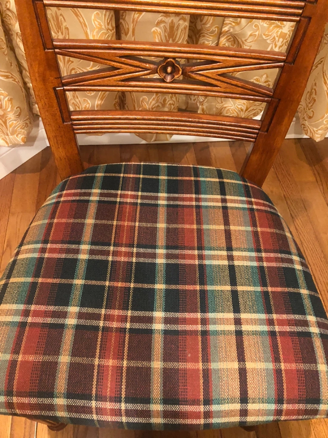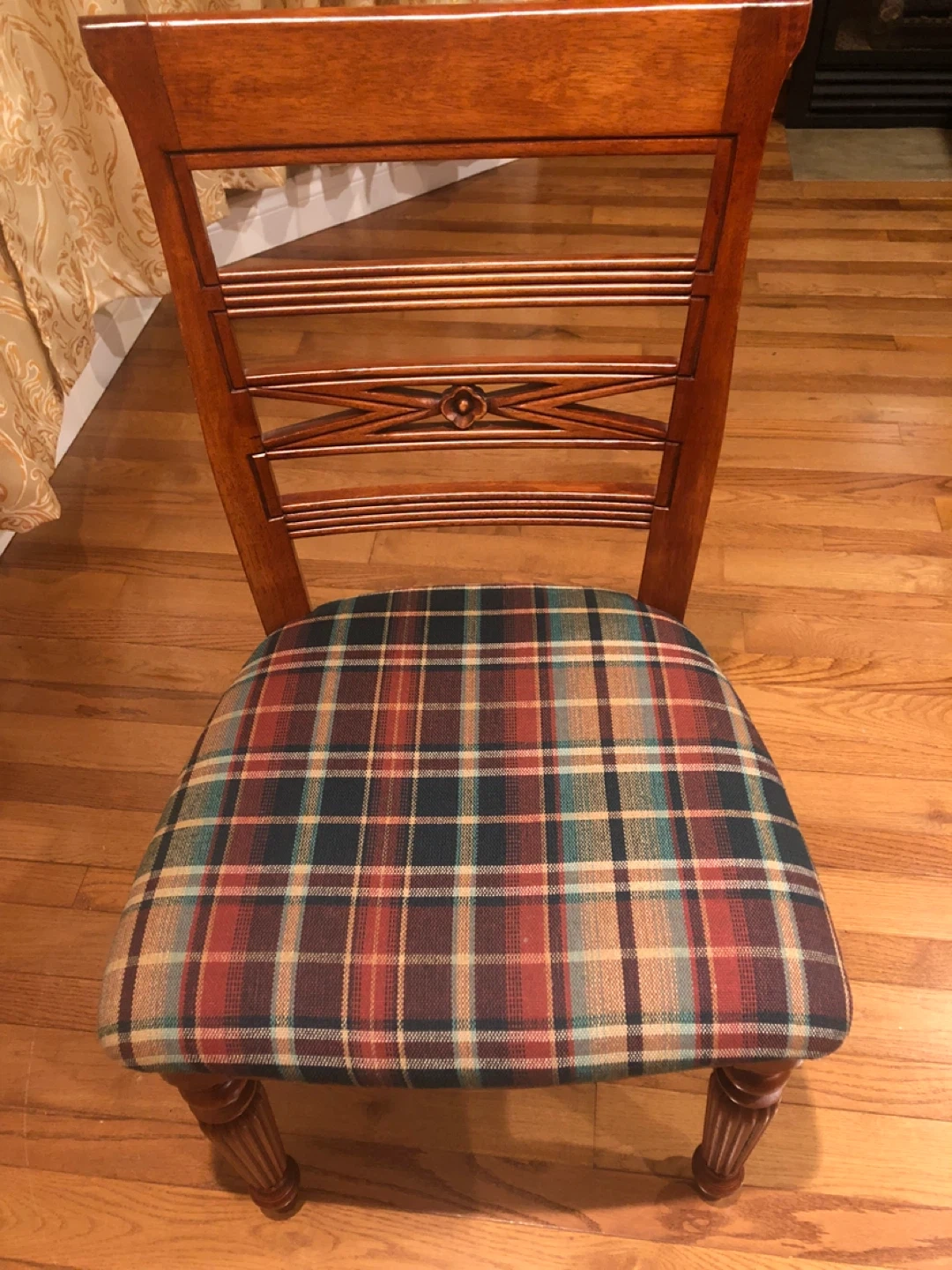 Here's a lovely wooden dining chair with a cozy plaid seat! It's perfect for adding a touch of warmth to your dining area or kitchen. The chair features a classic design with a decorative back. The seat has a traditional plaid pattern in shades of green, red, and brown.