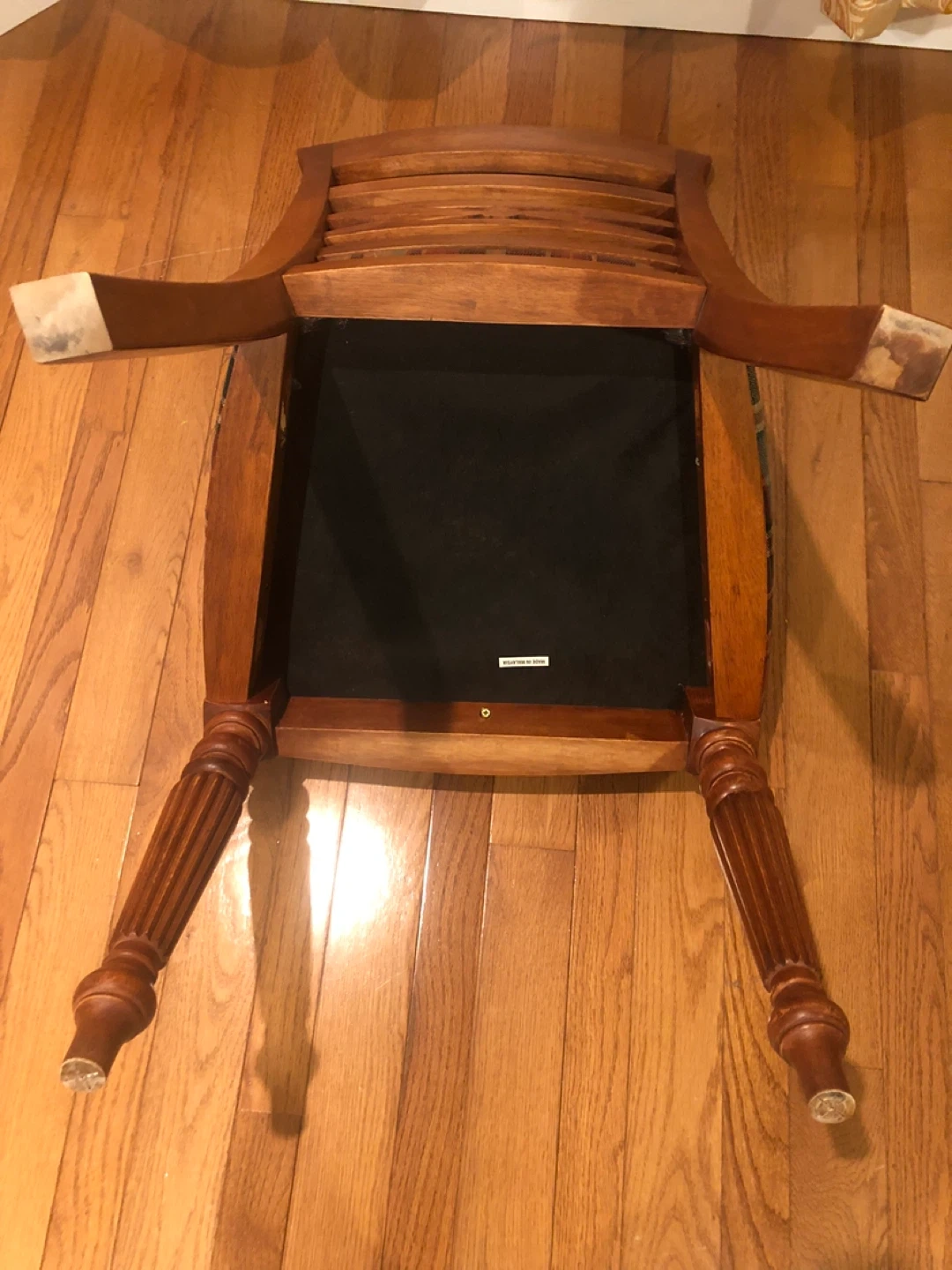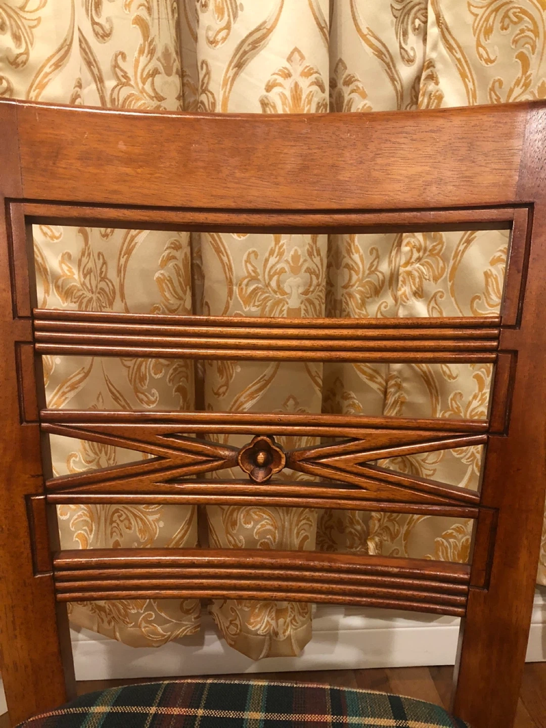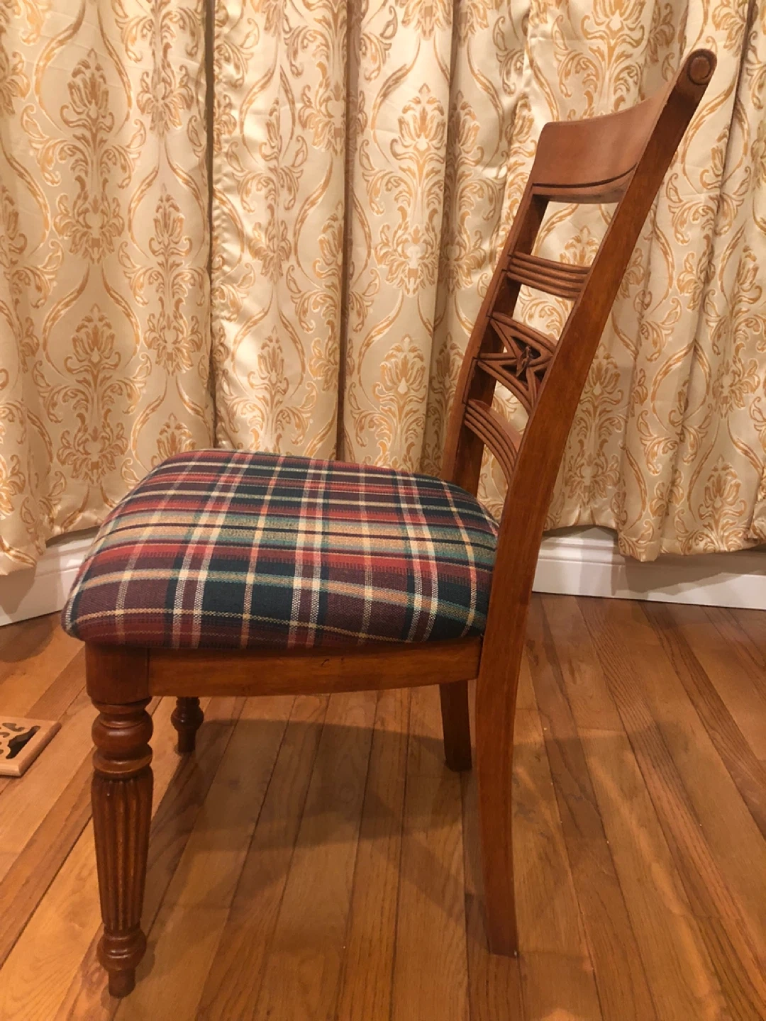 Here's a lovely wooden dining chair with a cozy plaid seat! It's perfect for adding a touch of warmth to your dining area or kitchen. The chair features a classic design with a decorative back. The seat has a traditional plaid pattern in shades of green, red, and brown.