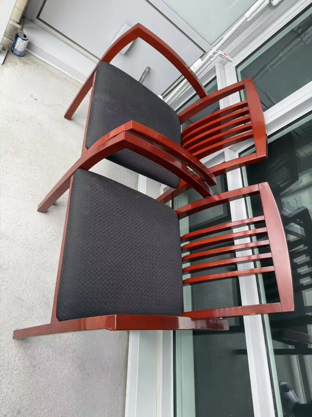 Selling a set of two wooden dining chairs! They feature a lovely dark gray fabric seat and a warm-toned wood frame. These chairs would be a great addition to any dining space. They are in good condition and ready for a new home!