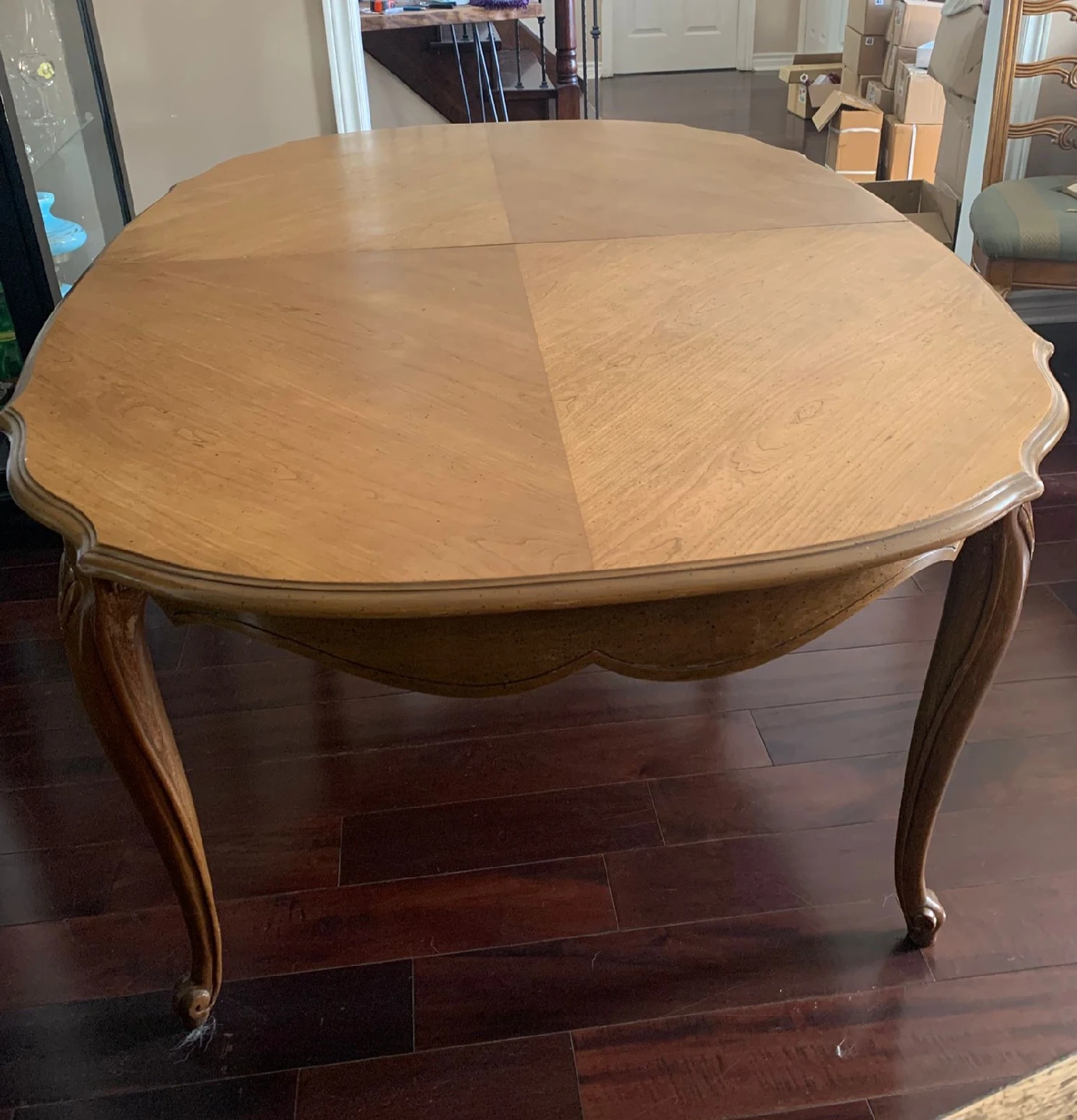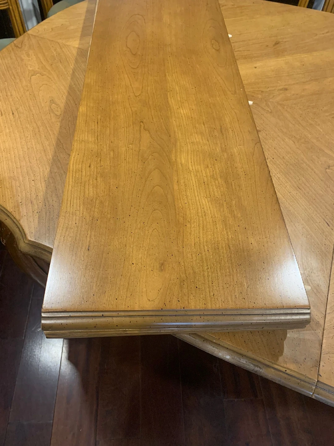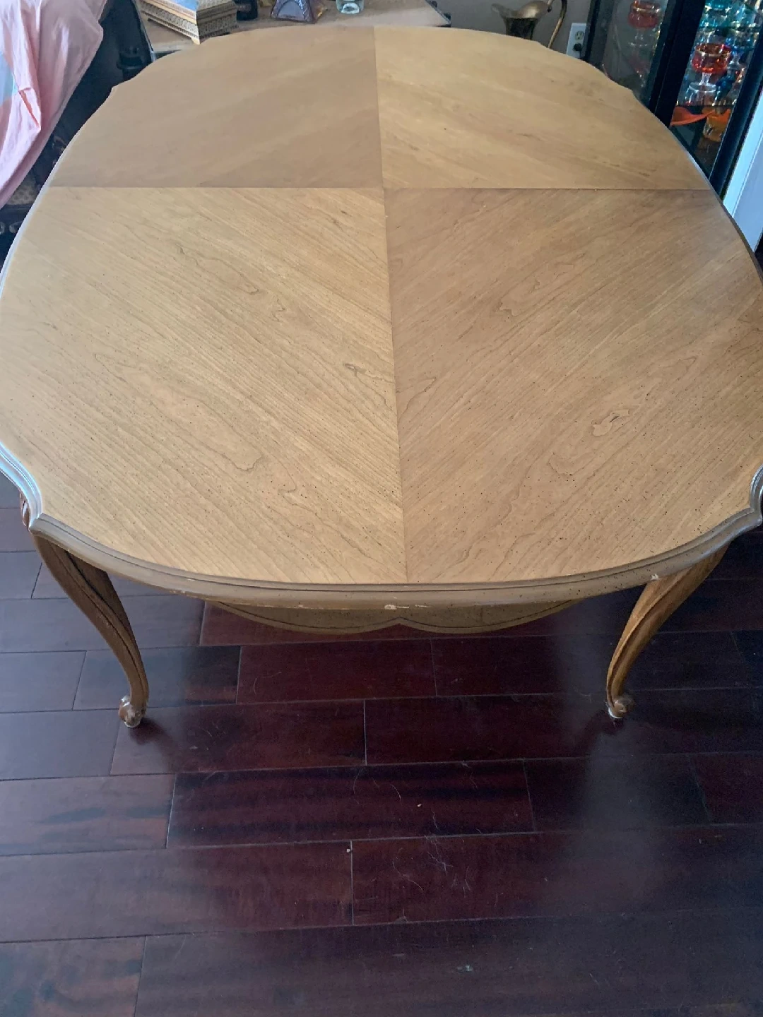 14Selling a wooden dining table in good condition. It's a sturdy table with a unique design on the surface and elegantly curved legs. Perfect for family dinners or gatherings, with 3 extra parts to extend table.
