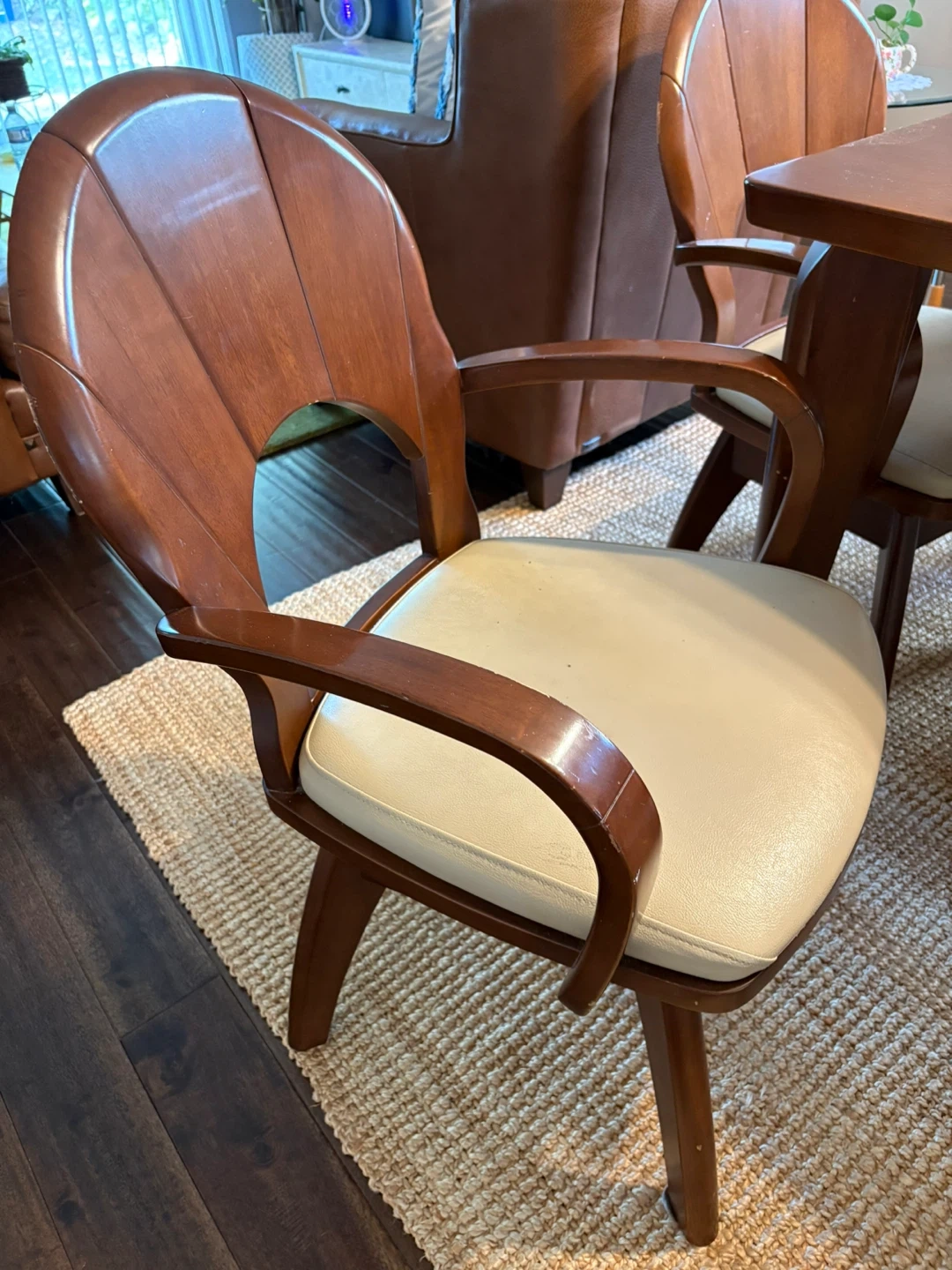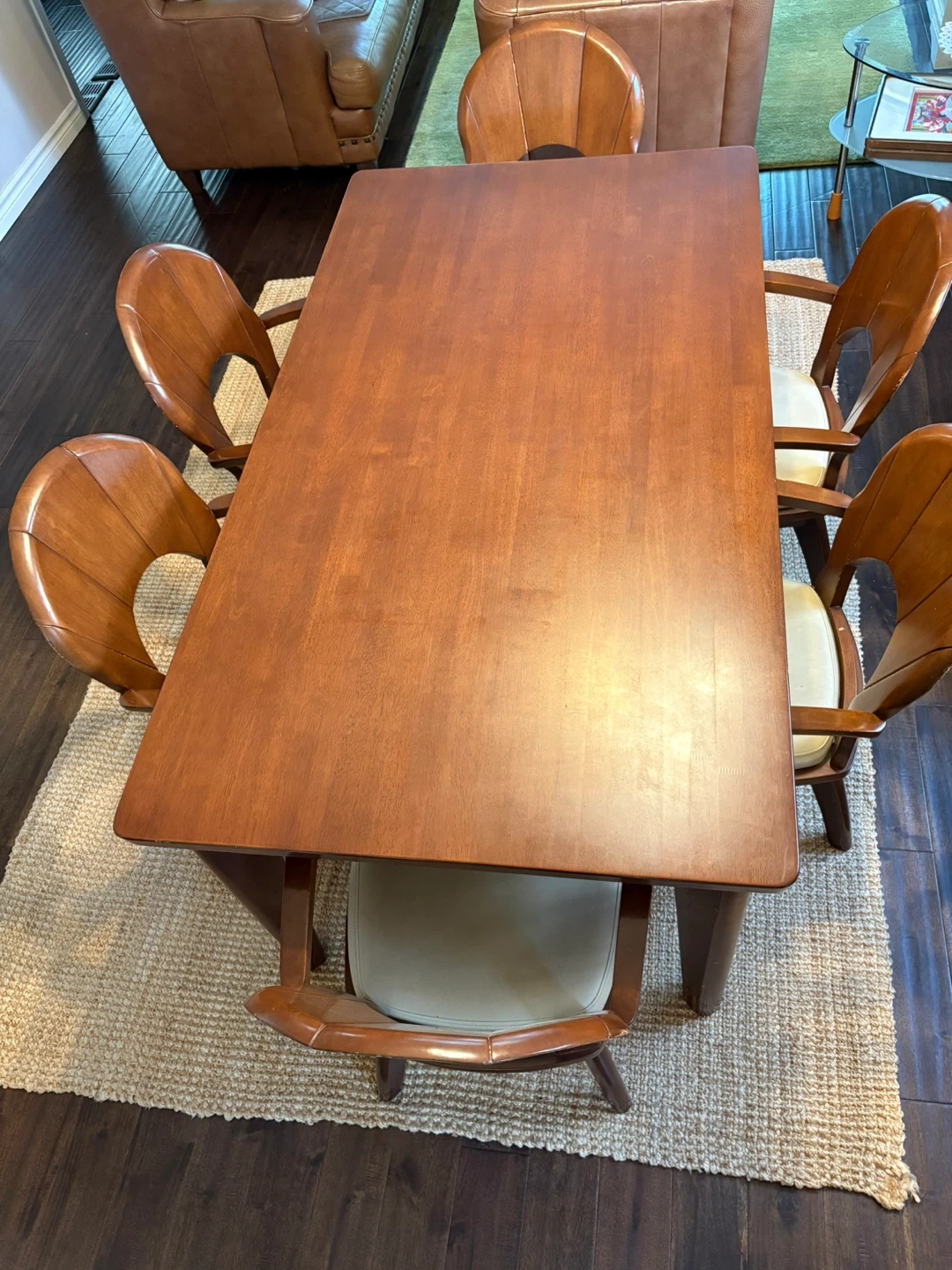 Selling a dining table with set of 6 wooden swivel chairs. They have a unique design with a curved back and neutral-toned seat cushions. Perfect for adding a touch of elegance to your dining space! The swivel chairs are in good condition and ready for a new home