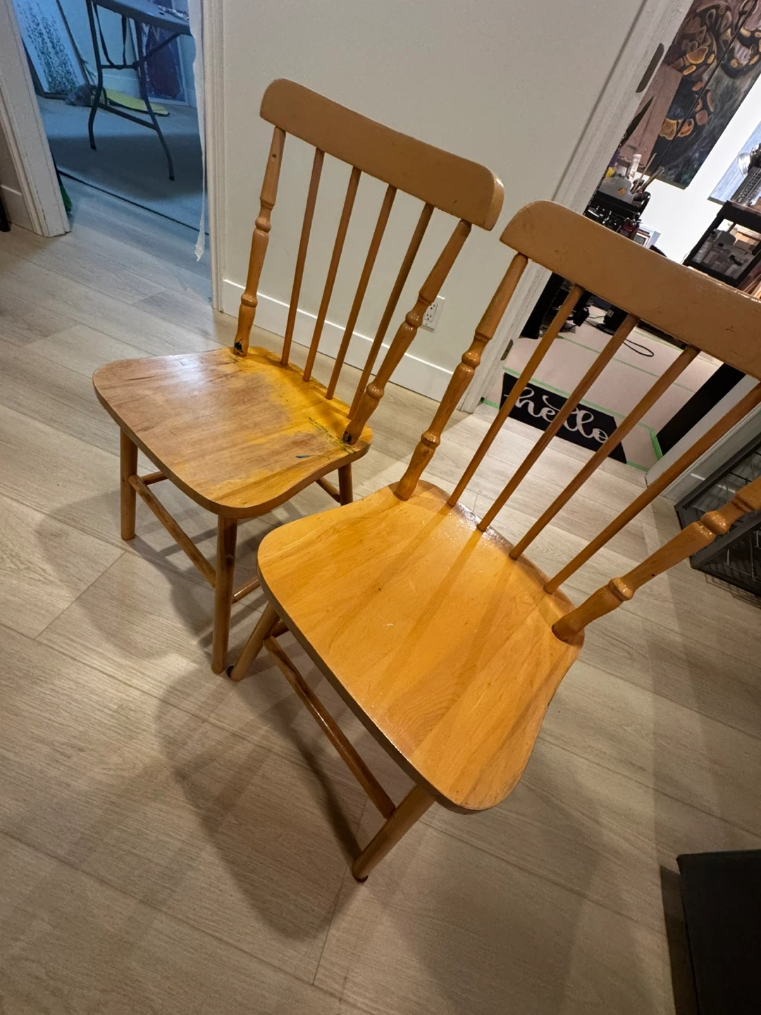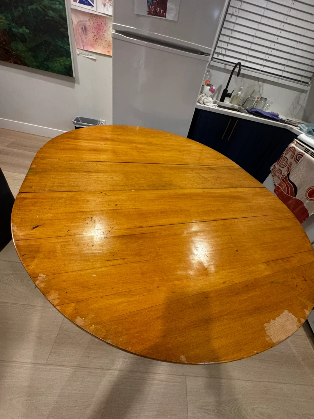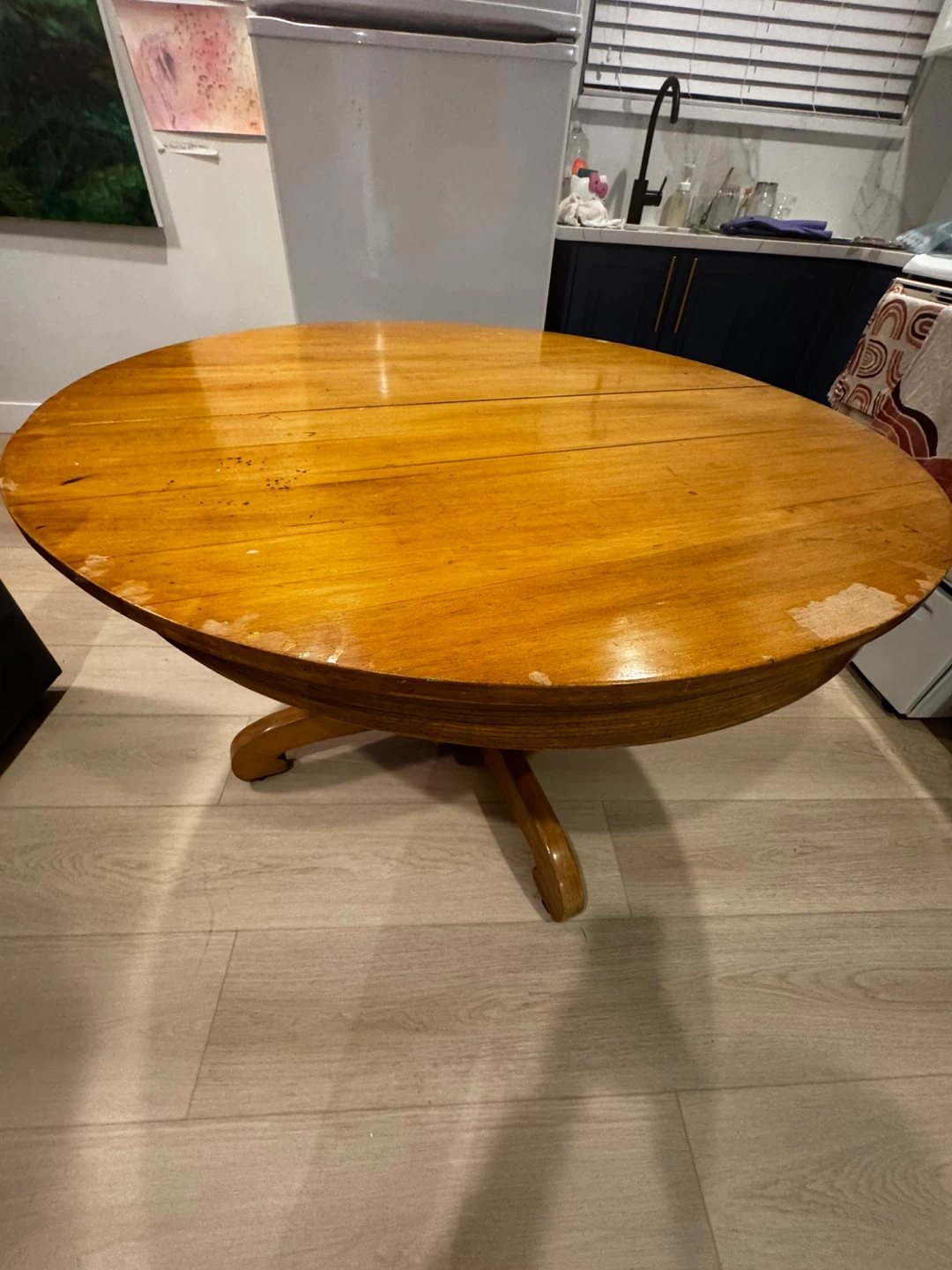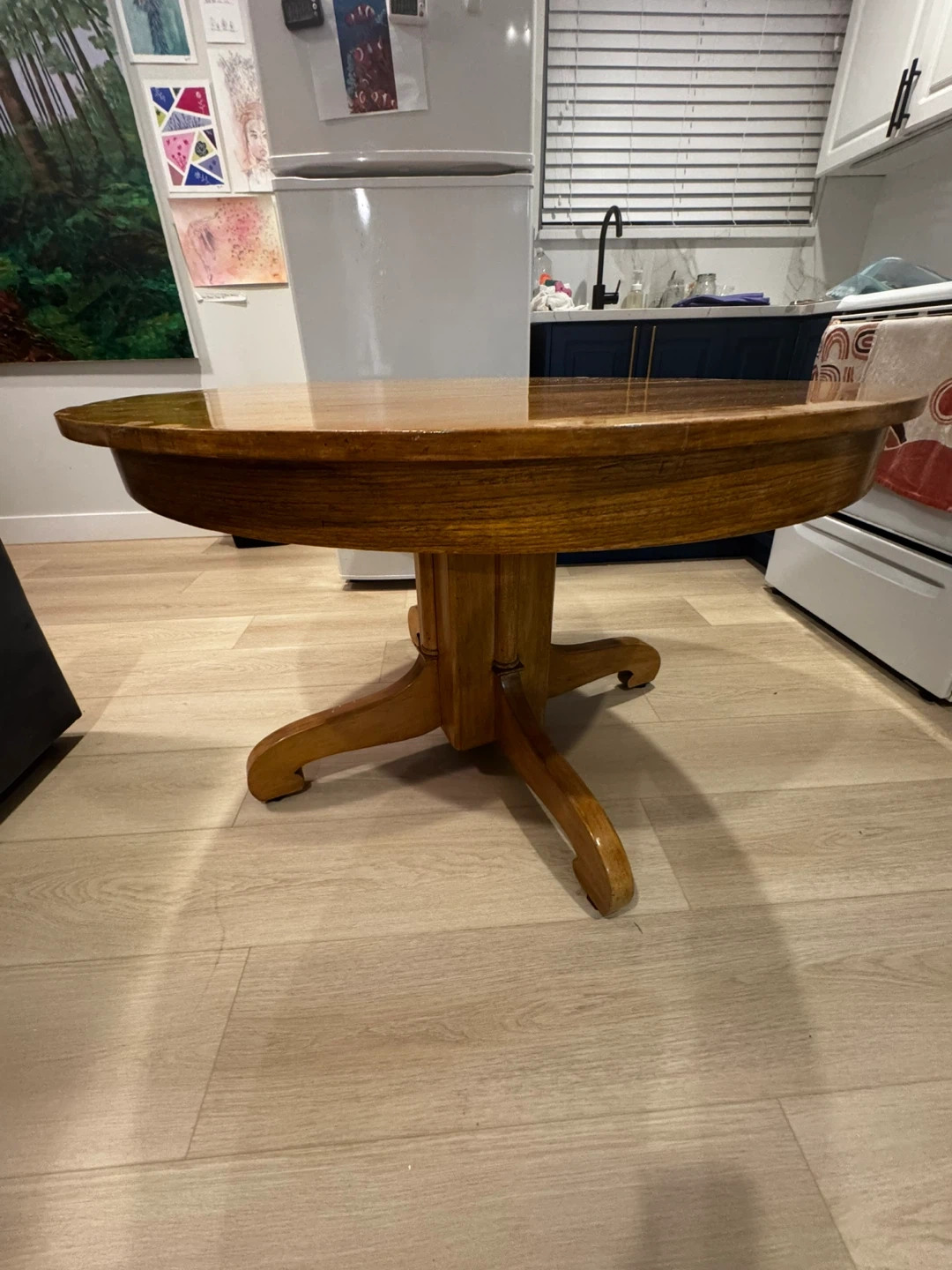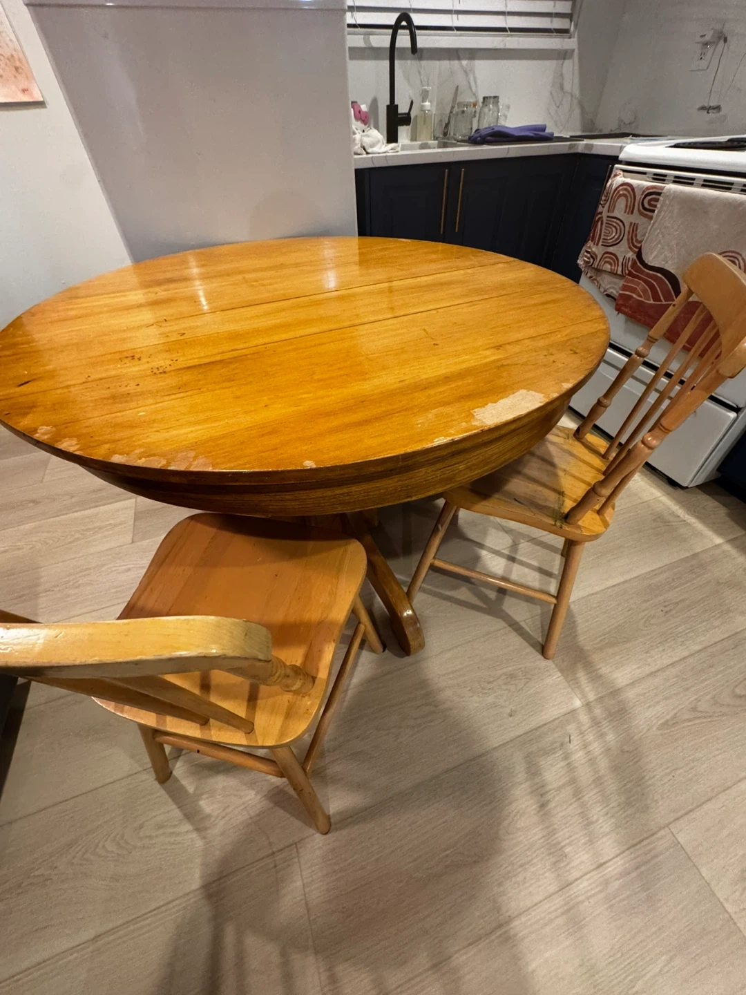 33Selling a wooden dining table with a set of 6 chairs. The set has some wear and tear, as shown in the pictures. It's a sturdy set, perfect for a kitchen or dining room. If you're interested, feel free to message me! Fun project for someone who wants sand and repaint. 45 inches in diameter. Extends up to 63 inches and can seat 6 people comfortably. Can be disassembled for easy transport.