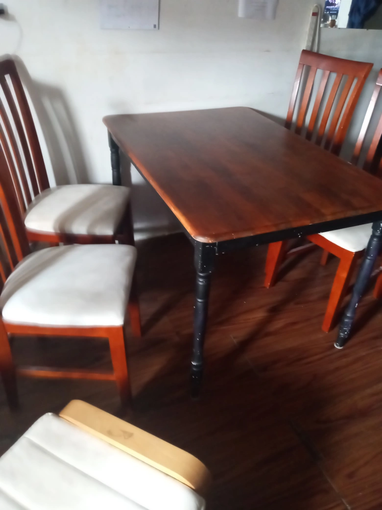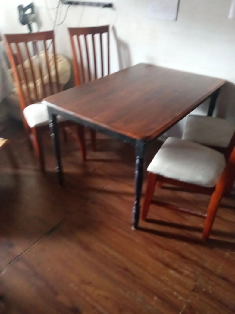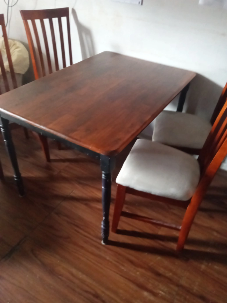 76Selling a wooden dining table with chairs. The table has a dark wood top and black legs, while the chairs have wooden frames and white cushions. Perfect for a small dining area or kitchen!
