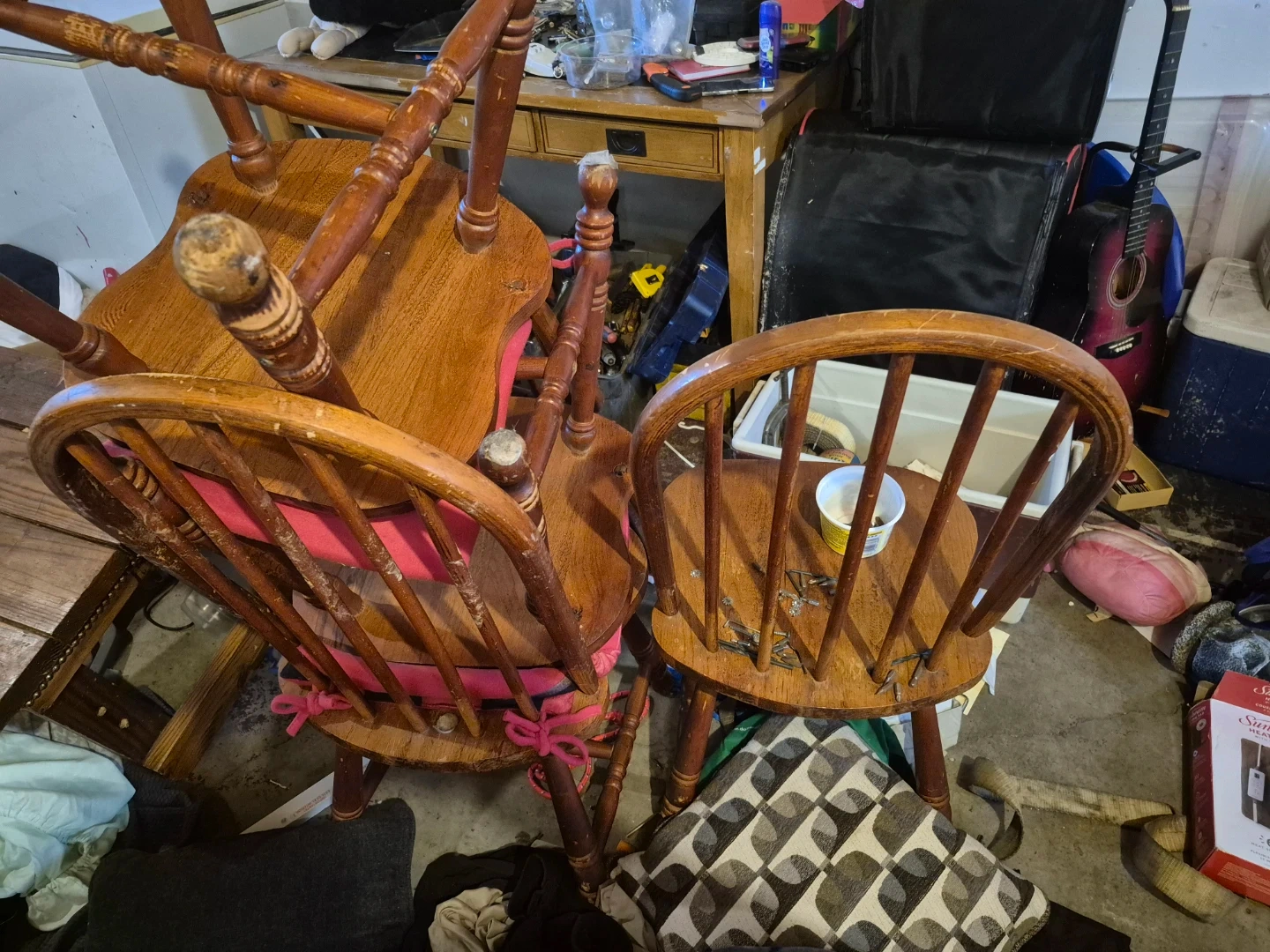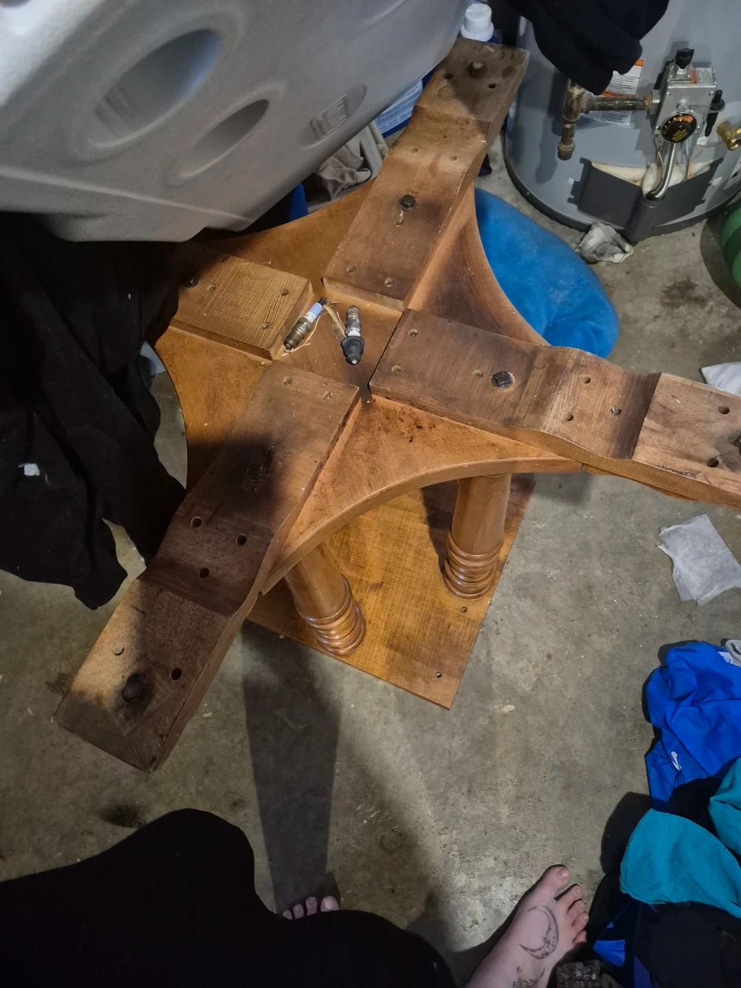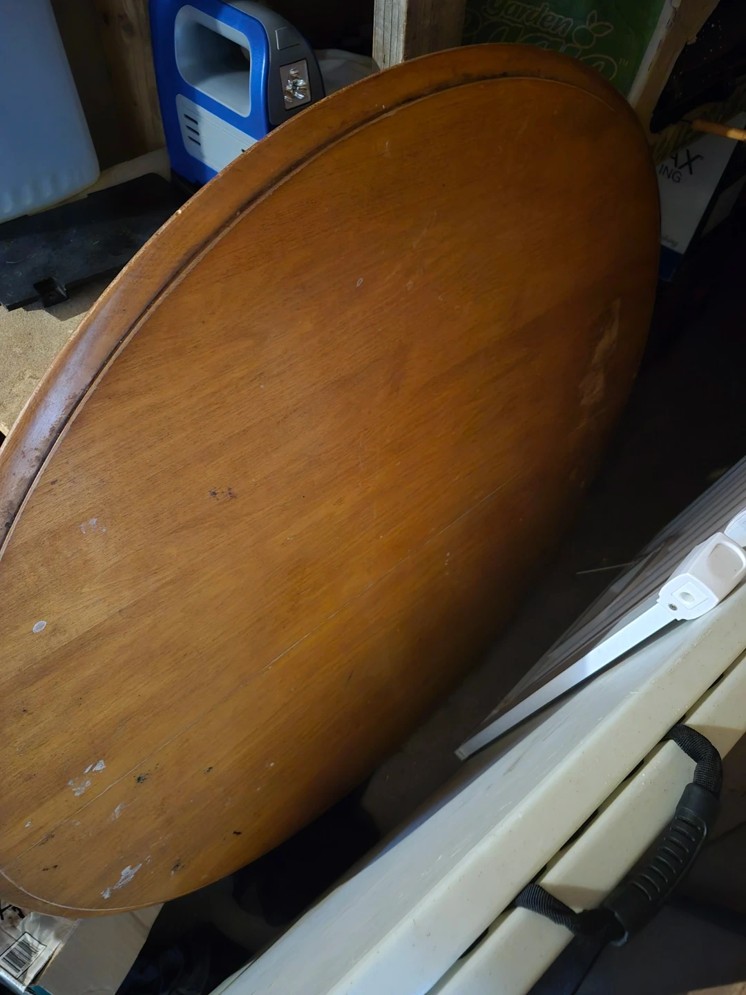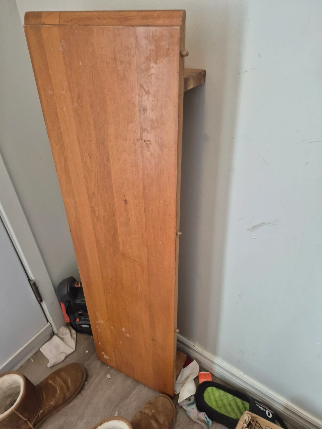 65Selling a wooden dining table with matching chairs. They're in used condition, perfect for a cozy dining space or a DIY project! The set includes a table top, a table base, and a few chairs.