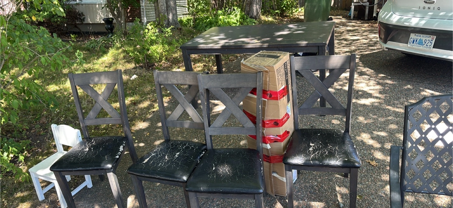 66Selling a used wooden dining table with chairs. The table and chairs show signs of wear and use, but are still functional. Great for a family or anyone needing a dining set!