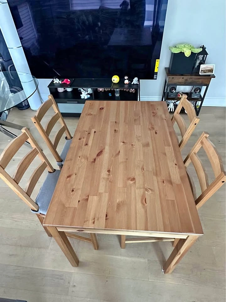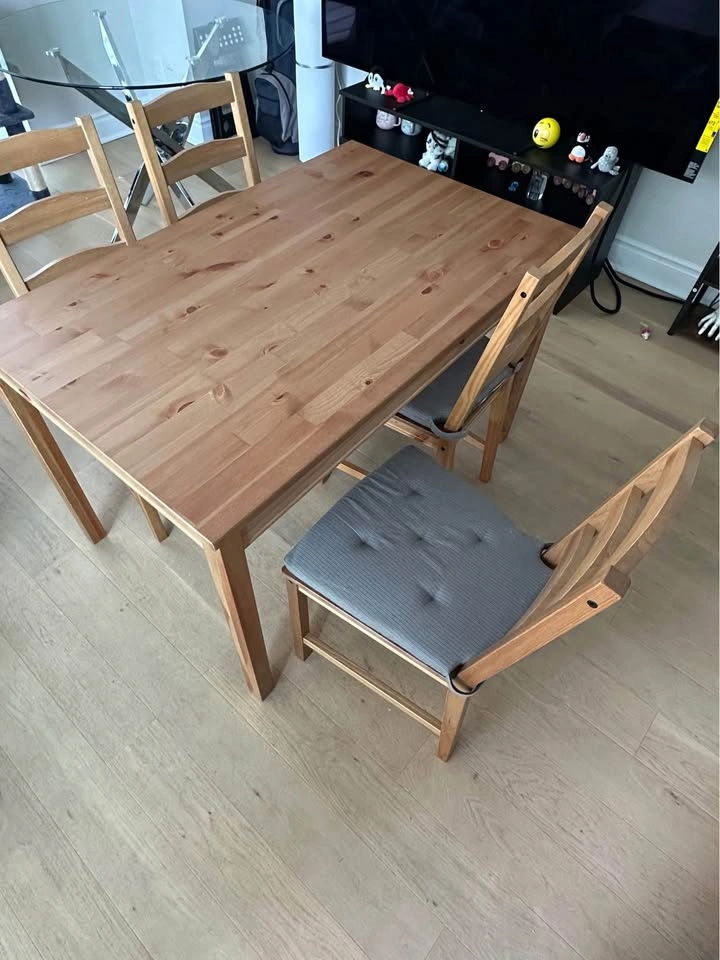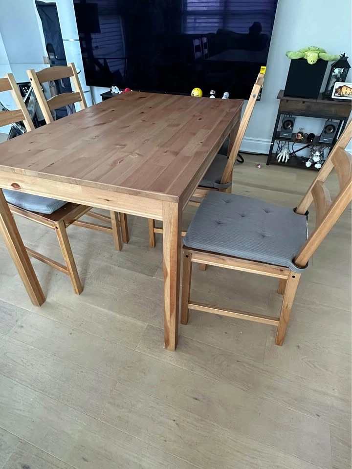 10Pure Wooden Dining Table for sale. Purchased for $300. Trying to sell it as part of move out. Selling price $120 or your best offer. Also, 4 cushions on chairs are included for free. The chairs & the table can be disassembled by removing the screws for easier transportation.