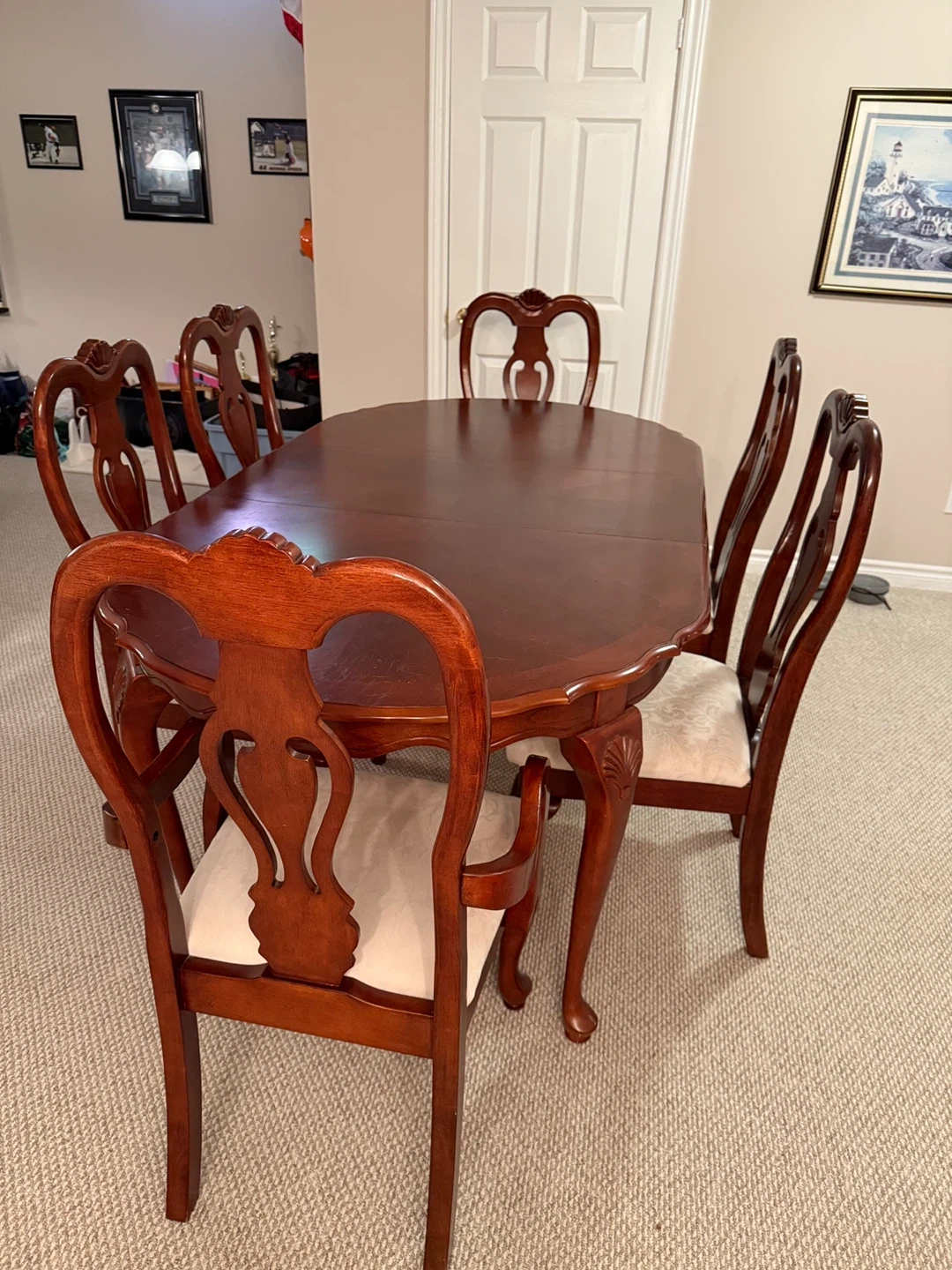Selling a beautiful wooden dining table set, complete with six chairs! The set features a classic design with intricately carved details on the chairs and table legs. It's perfect for family dinners or entertaining guests. The chairs have comfortable, upholstered seats.