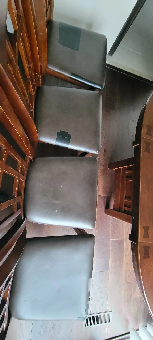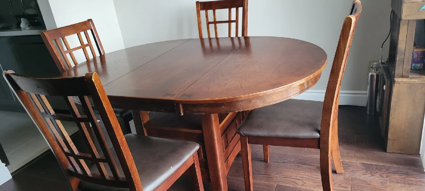 Selling a wooden dining table with four matching chairs. It is convertible from round table to save space into an oval to make the table bigger. The table has a classic design and is perfect for family meals. The chairs have padded seats for extra comfort. There are some signs of wear and tear, but overall it's in good condition and ready for a new home! SERIOUS BUYERS ONLY MUST BE PICKED UP BETWEEN NOV 10-13