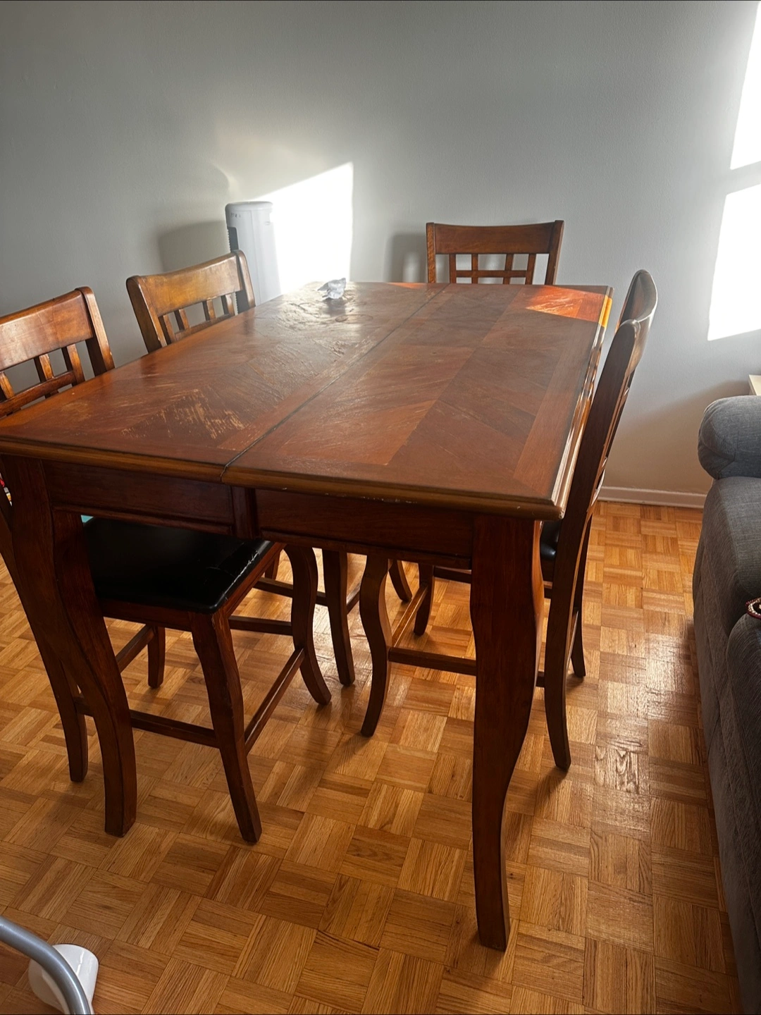 Selling a solid wooden dining table that comes with four matching chairs. It's a great set for a family or anyone who enjoys having guests over for dinner. The chair cushion are bit torn. I have a new 2 pair of cushion cover to puton, bought online. I can give it for extra cost.
