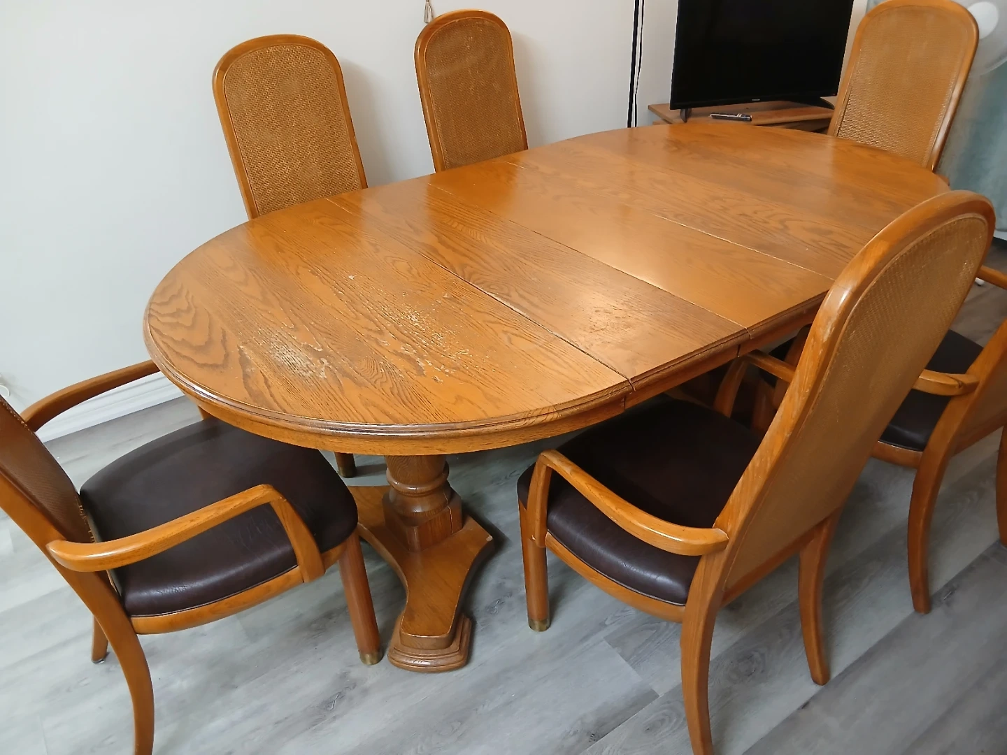 67Selling an extended wooden dining table with six chairs. The chairs have a woven cane back and brown leatherette seats. The table has an oval shape and a pedestal base. It shows some signs of wear, but is still in fair condition for everyday use!