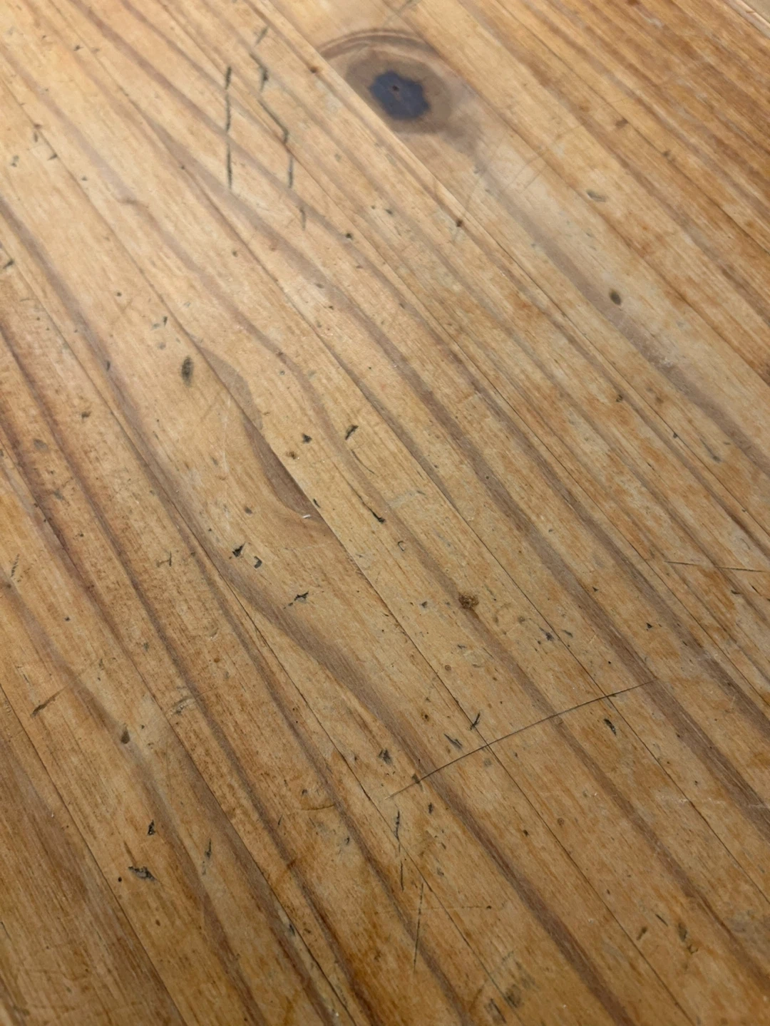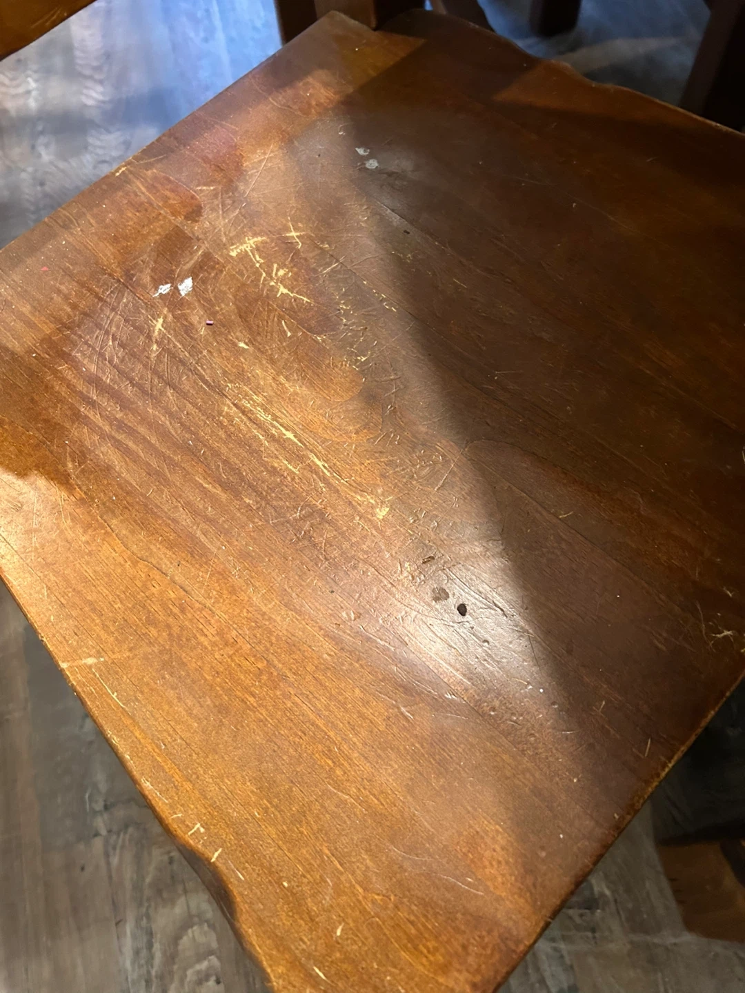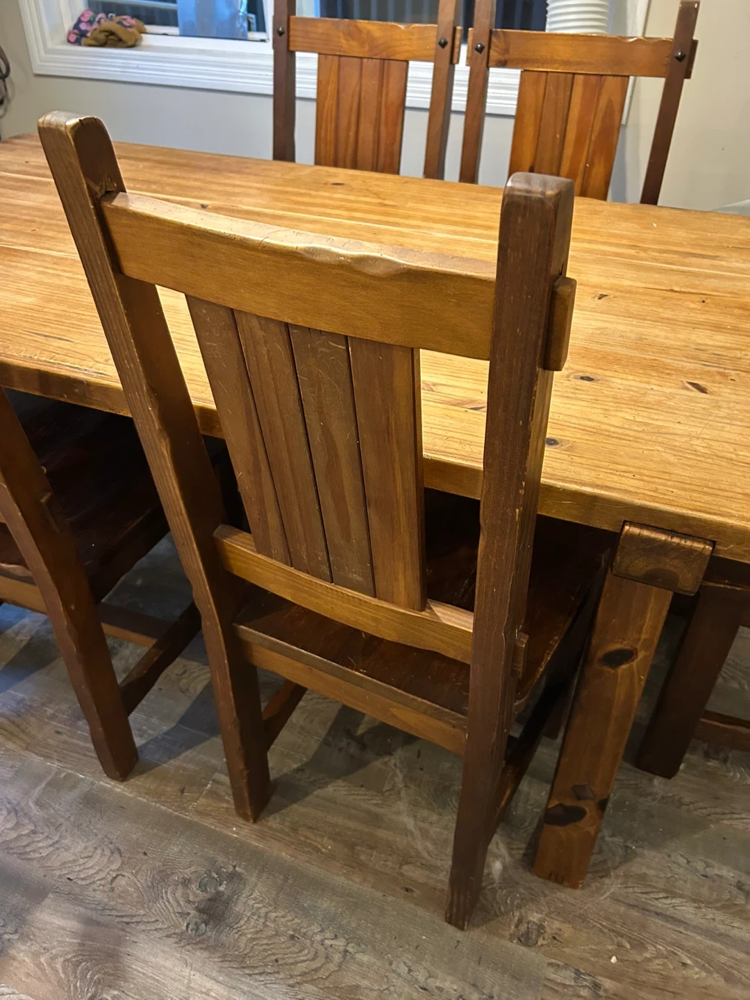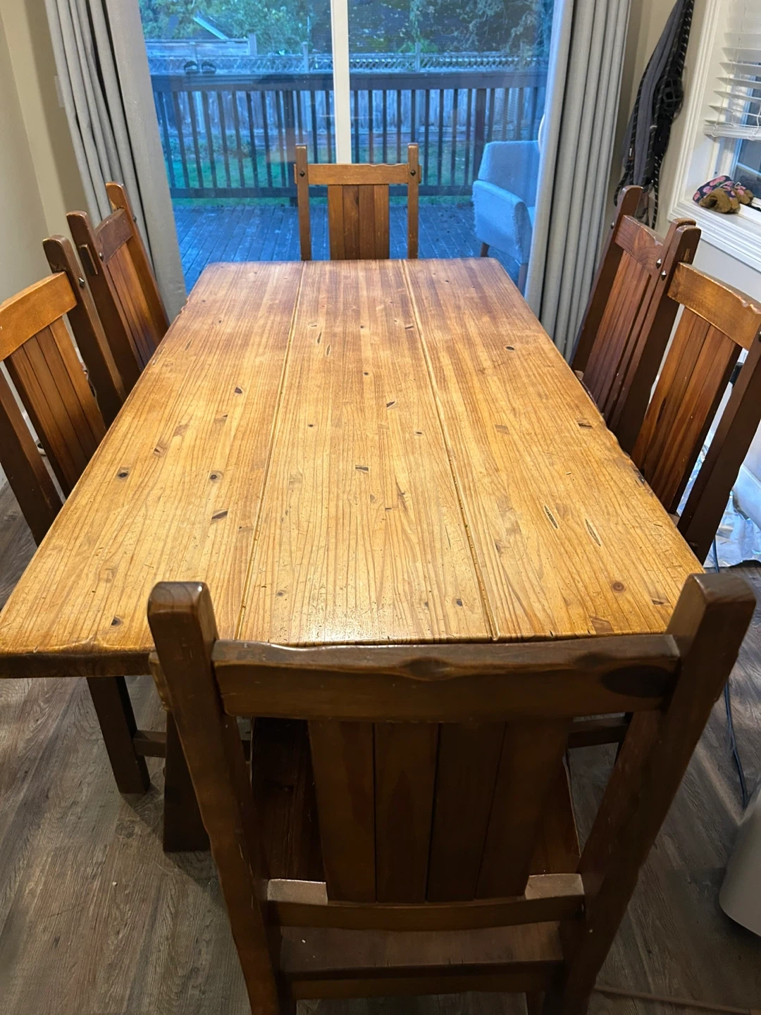 Selling a wooden dining table with six matching chairs. There are some signs of use, including scratches on the tabletop and chairs, but it's still a sturdy and functional set! It would be perfect for someone who loves a project! Originally from Pier 1