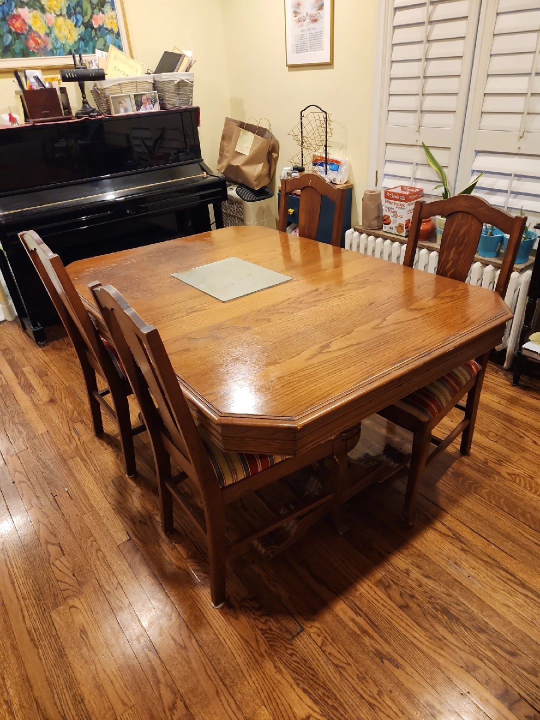 Selling a lovely wooden dining table complete with four matching chairs. It's in great condition and ready to be the centrepiece of your dining room! The chairs have striped cushions. solid wood. comes with extension piece in the middle