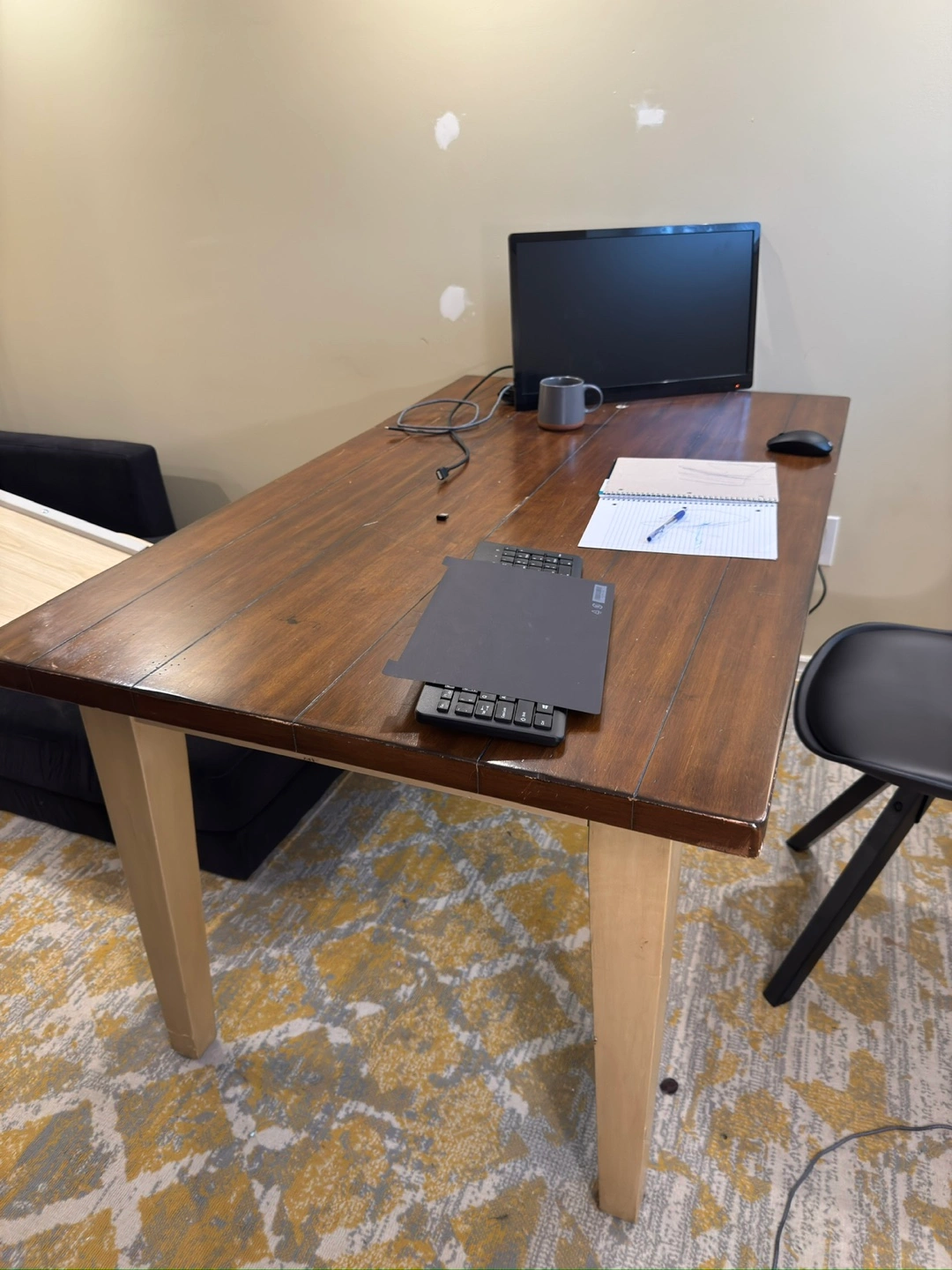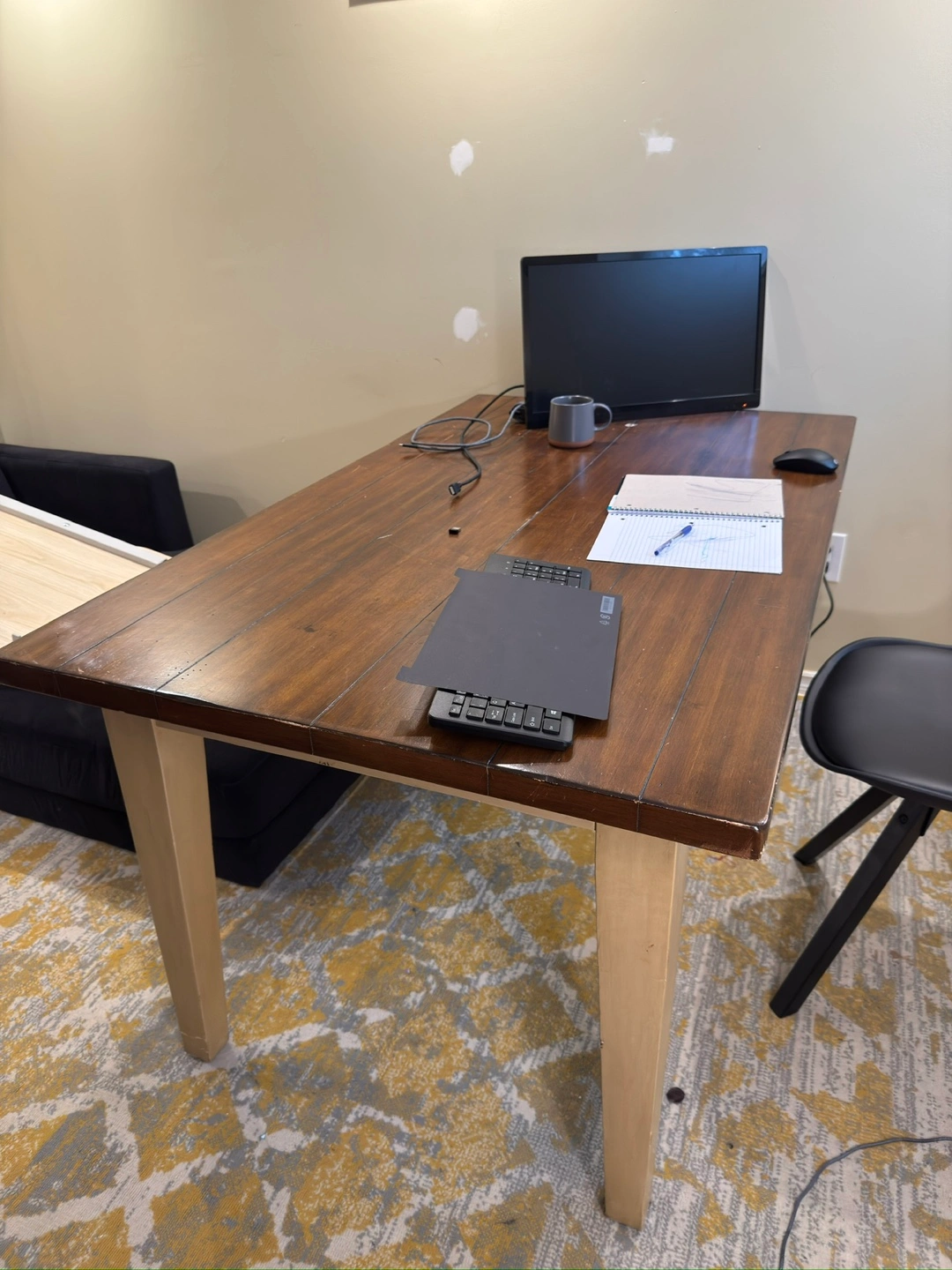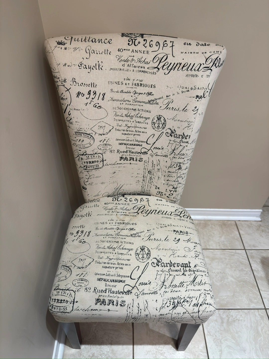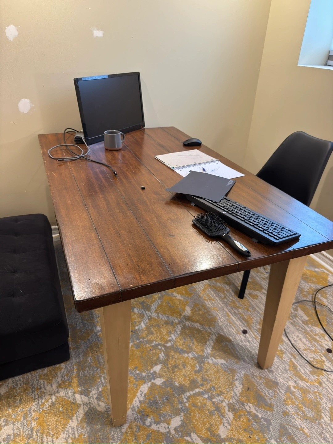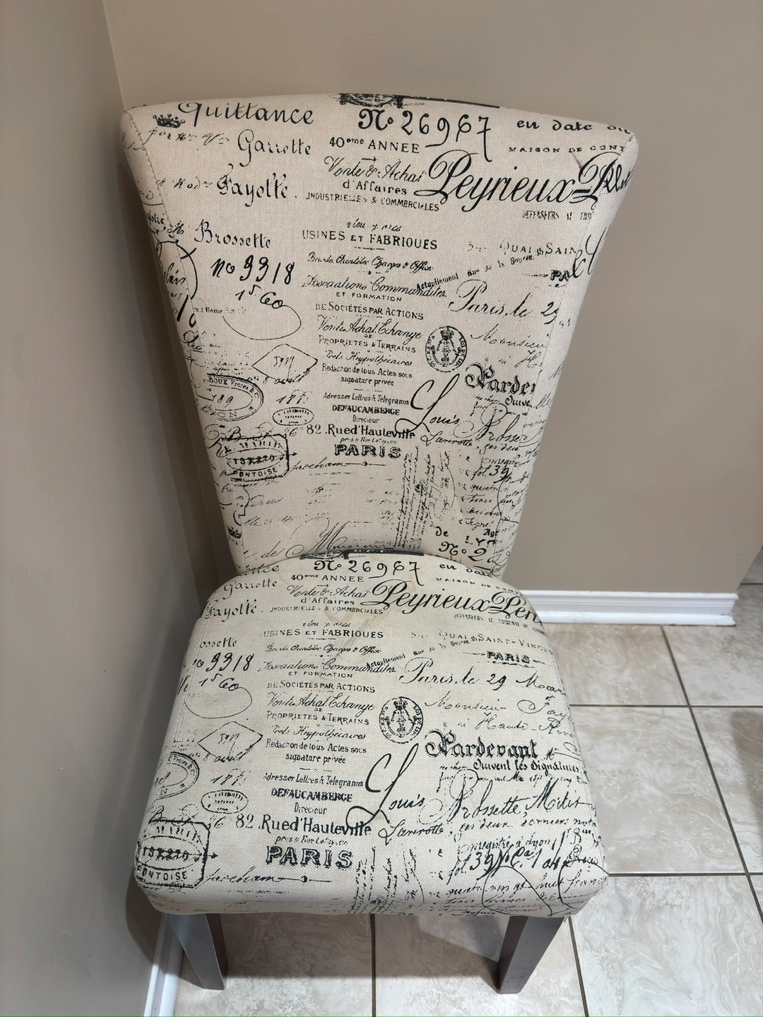 Selling a sturdy wooden dining table, perfect for a kitchen or dining area. The table has a warm, inviting finish and comes with 2 chairs. The chair features a unique printed design, adding a touch of character to any room