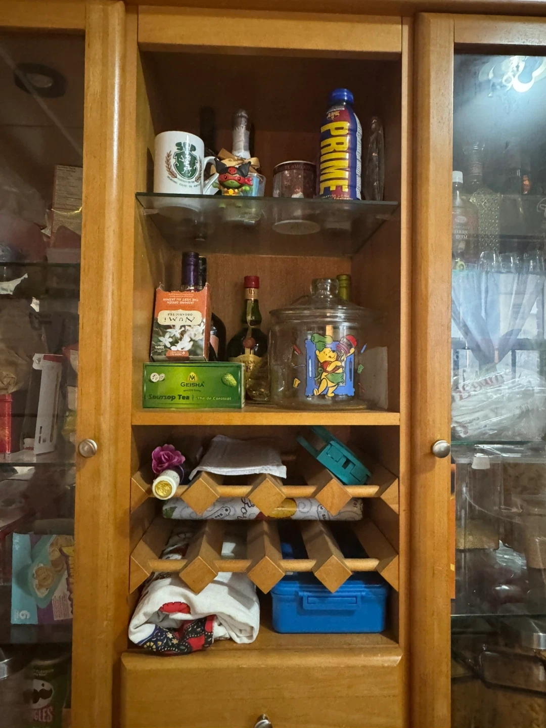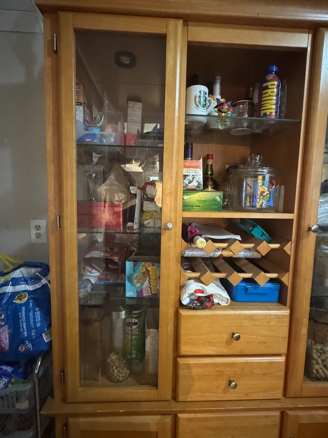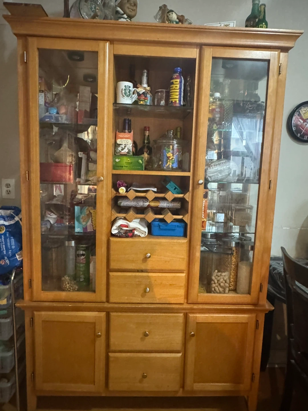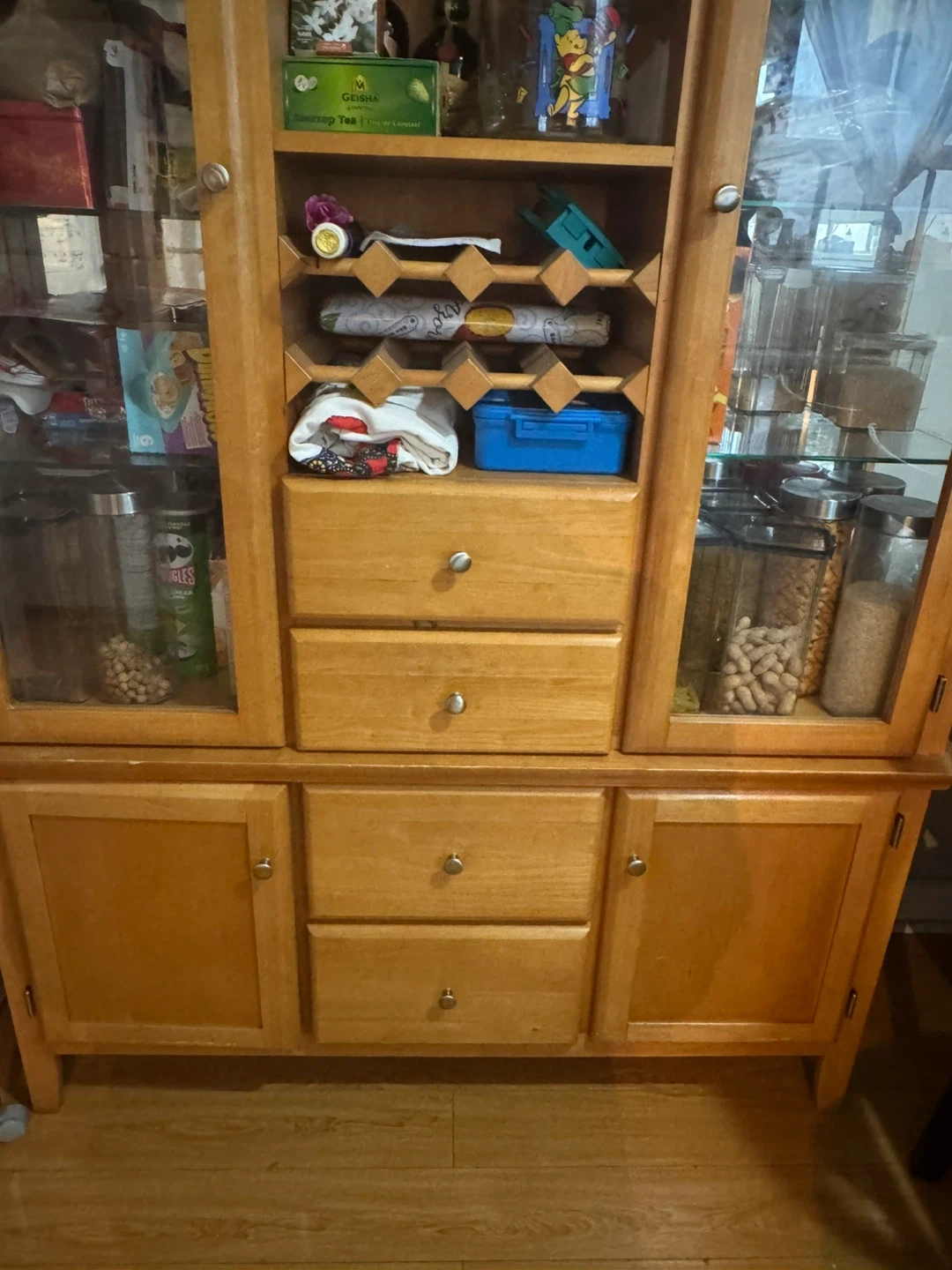 76Selling a wooden display cabinet. It has glass doors on the top half and wooden doors on the bottom half. There are also drawers for storage. It's perfect for displaying your favourite items! L 48” x W 15” x H 76”