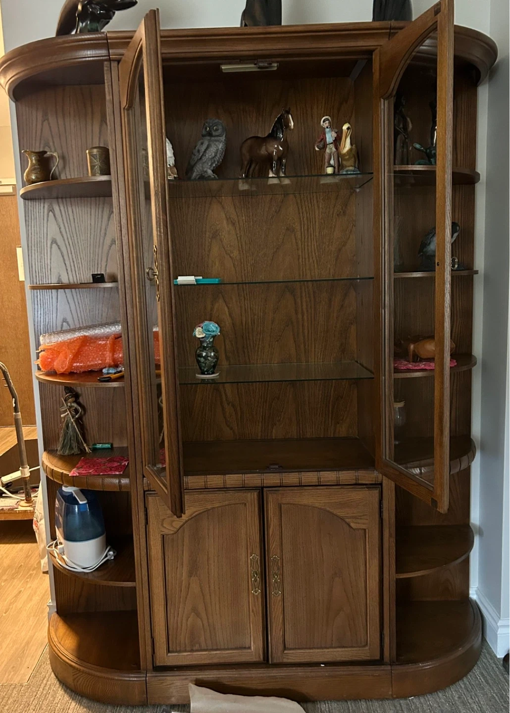30Selling a lovely wooden display cabinet! Can be set up as in photo or in 3 parts as the corner shelves can be set separately. Solid oak. It has glass doors on the top half and solid doors on the bottom. Perfect for displaying your favourite items or storing things away neatly. It's in good condition and ready for a new home!