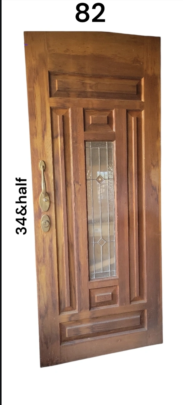 Selling a wooden door that features a decorative glass insert. The door measures approximately 82 inches in height and 34.5 inches in width. It has a classic design with raised panels and a brass handle. A great option for adding character to your home.It was my front door till the mid 90's I believe that my grandparents may have had it since they purchased my house in the early 80's