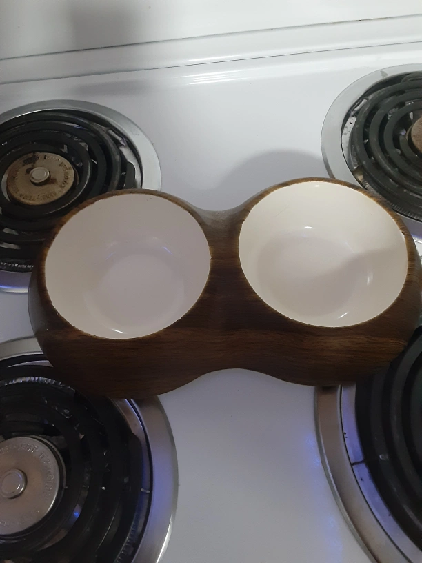 Here's a unique wooden condiment server with two white ceramic bowls. It's in great shape and ready to hold your pets food and water!