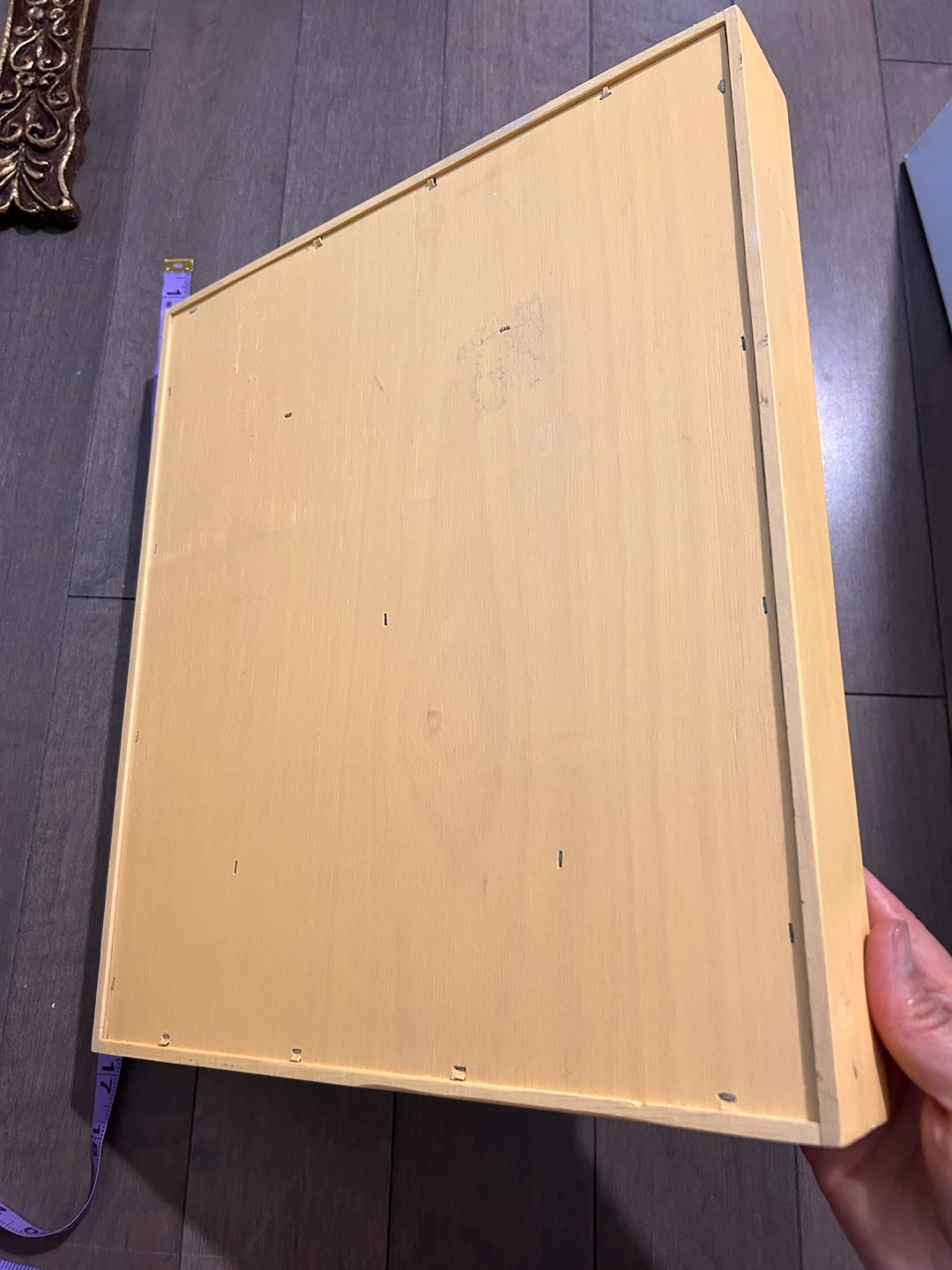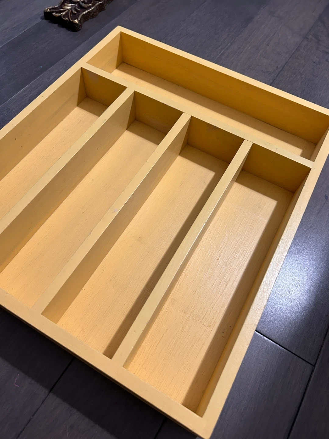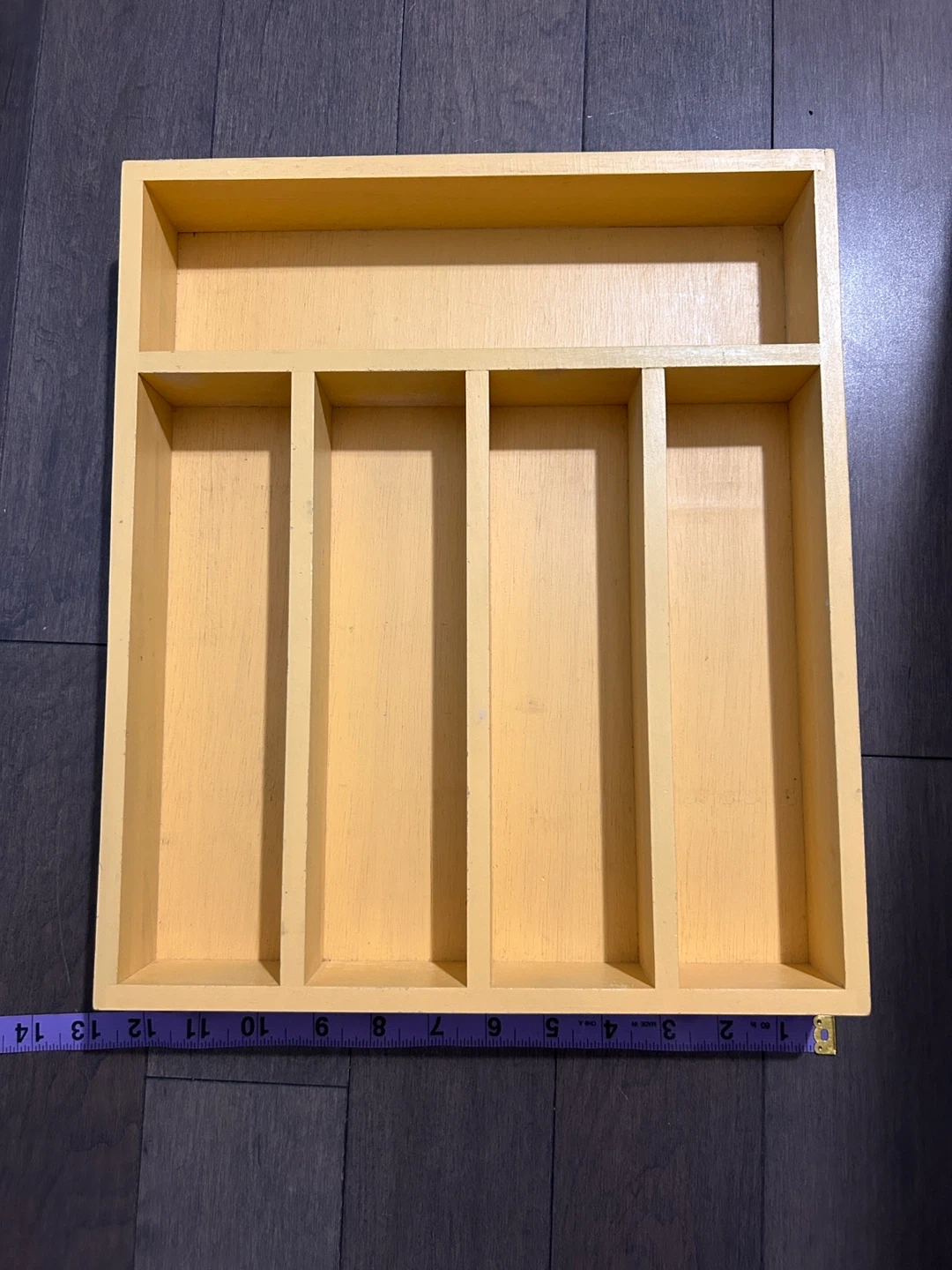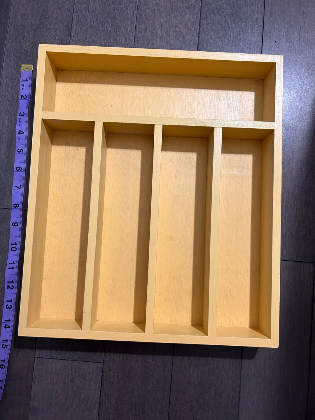 Selling a wooden drawer organizer, perfect for tidying up your space! It's a light yellow colour and measures approximately 16 inches by 16 inches. It has a few compartments to keep things neat and organized. Great for any room in the house