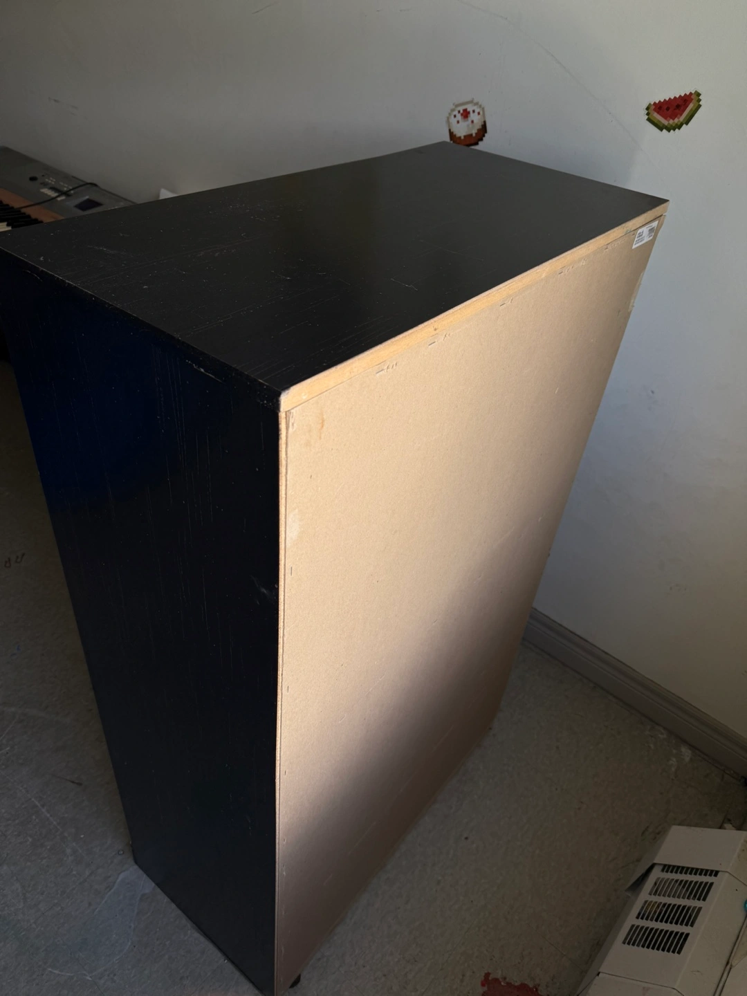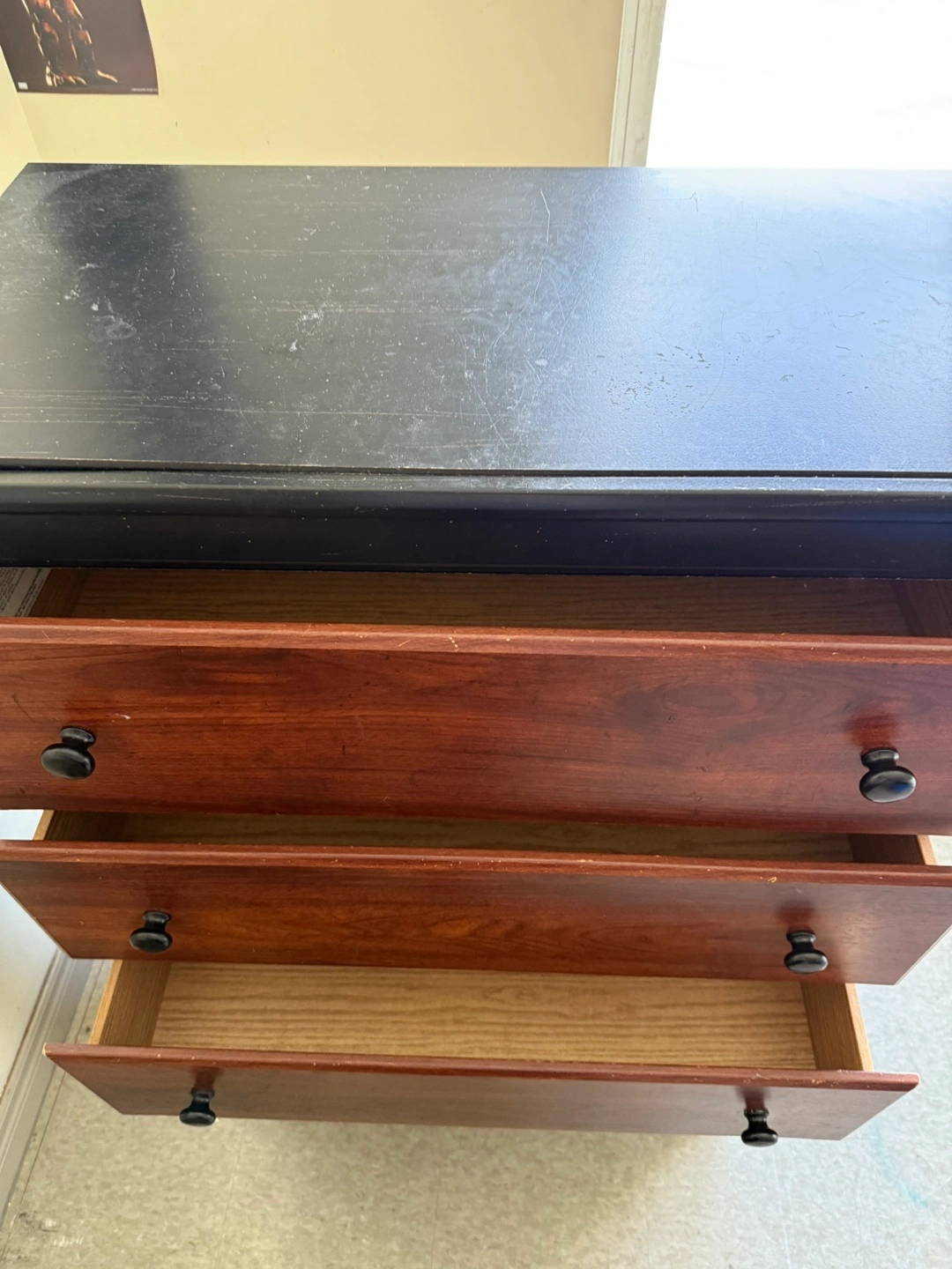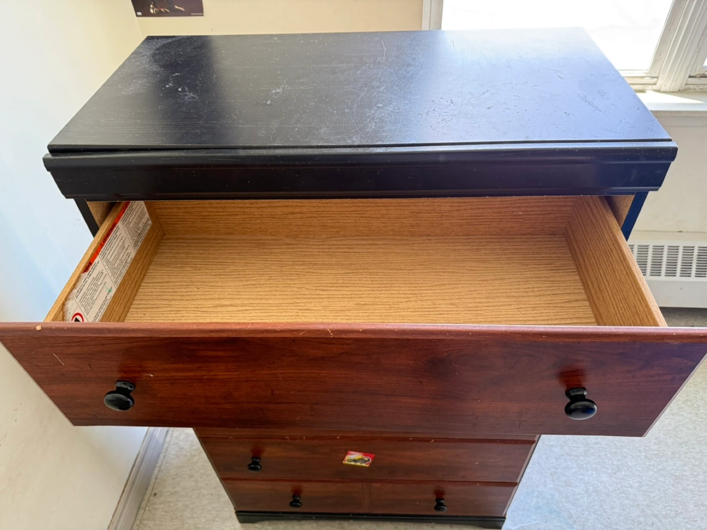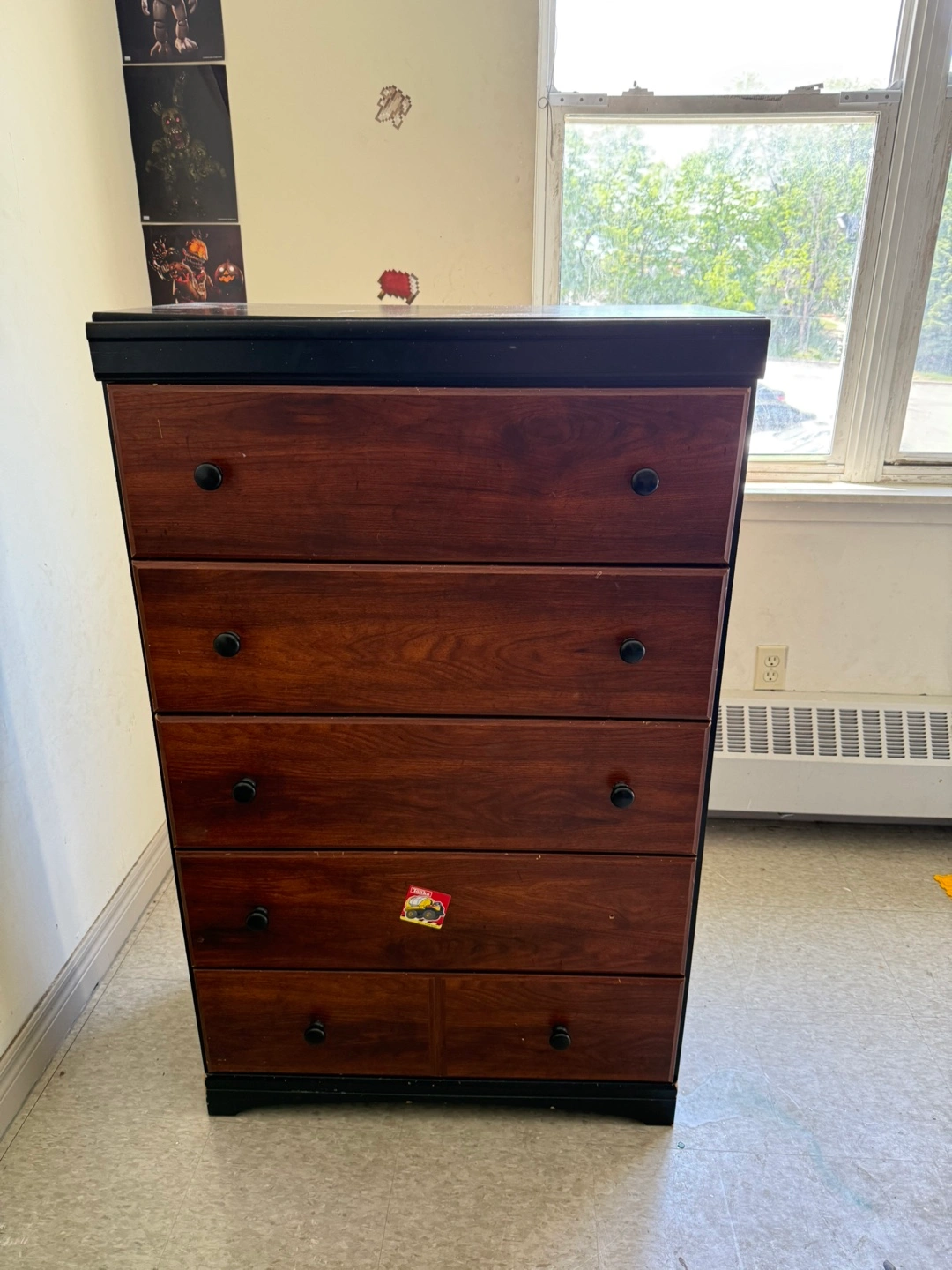 I am selling a dresser with five drawers. Dresser has a black top, and wooden drawers with black knobs. A great addition for any bedroom, offering ample storage space for your belongings. Dimensions- D16” x W30” x H48” Genuine buyers please contact Price is firm and accept only cash.!