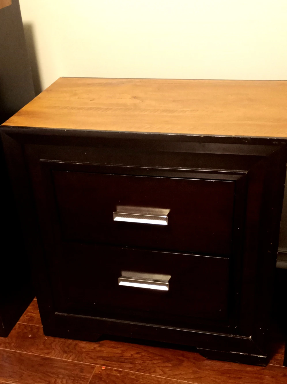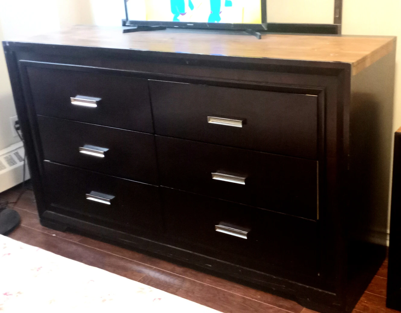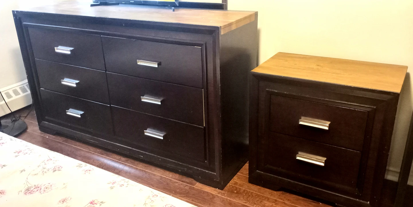 90Wooden Dresser with 6 drawers and mirror and a night table with 2 drawers. Well used. Dresser: L/W/H= 67/19/ 38 inch. Night table: L/W/H= 28.5/17/28 inch. Pay at the pick up site. Pay cash or e-transfer.