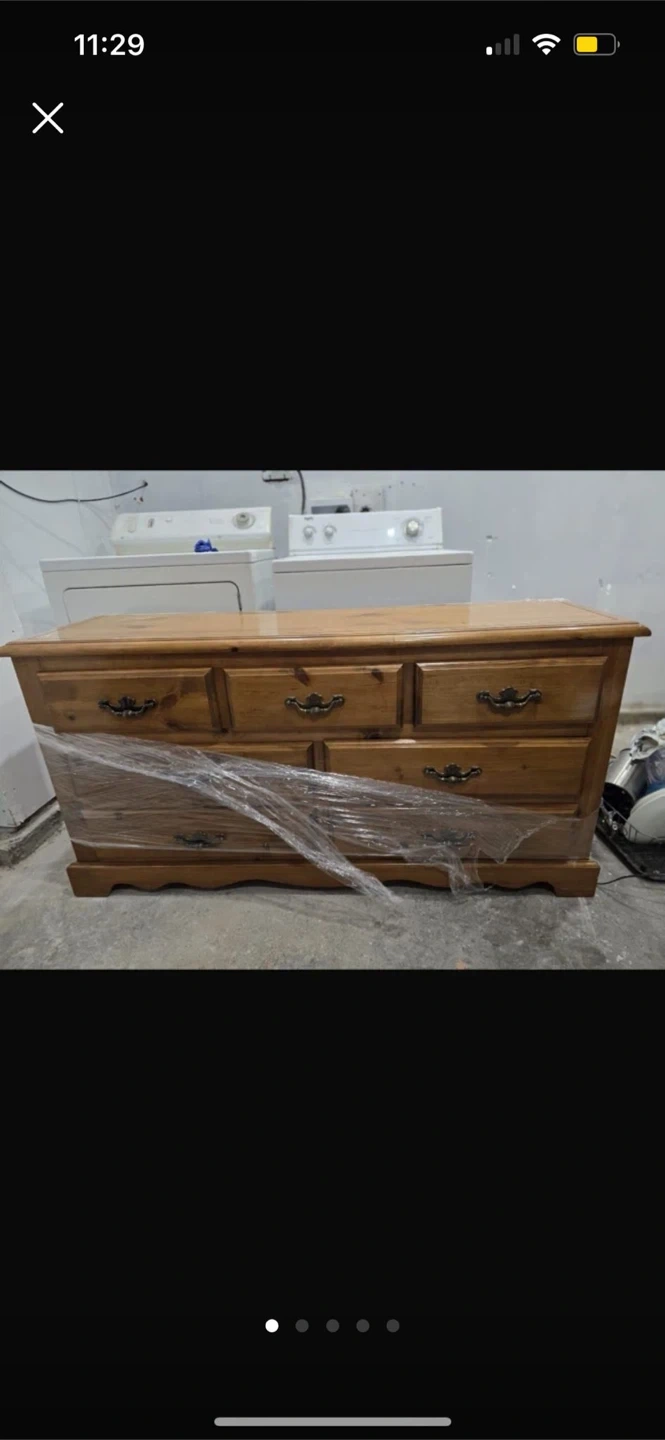 60Selling a wooden dresser with six drawers! It's a great piece for adding storage to any room. The dresser is wrapped in plastic for protection during transport, and the drawers are spacious and in good condition.