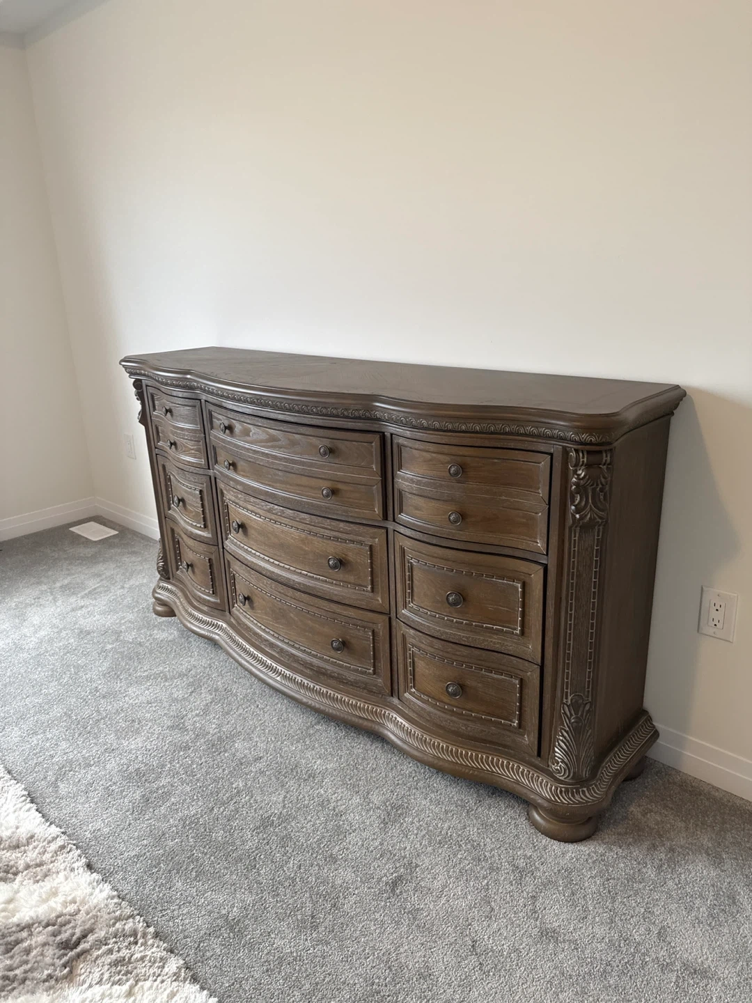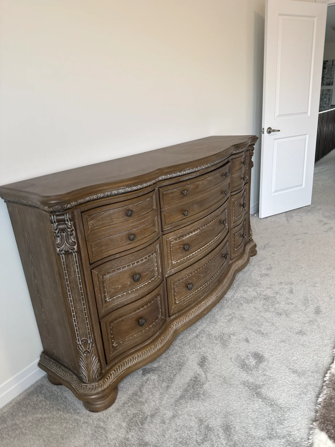 26Here's a lovely wooden Ashley furniture dresser with nine drawers! It has a beautiful, classic design with ornate detailing. It's in great condition and would be perfect for adding storage and style to any bedroom. This is cash and carry. You will need movers to come and get dresser