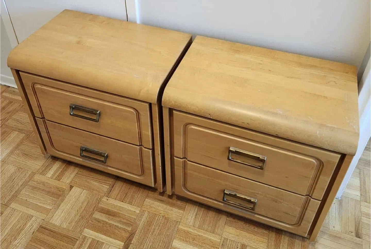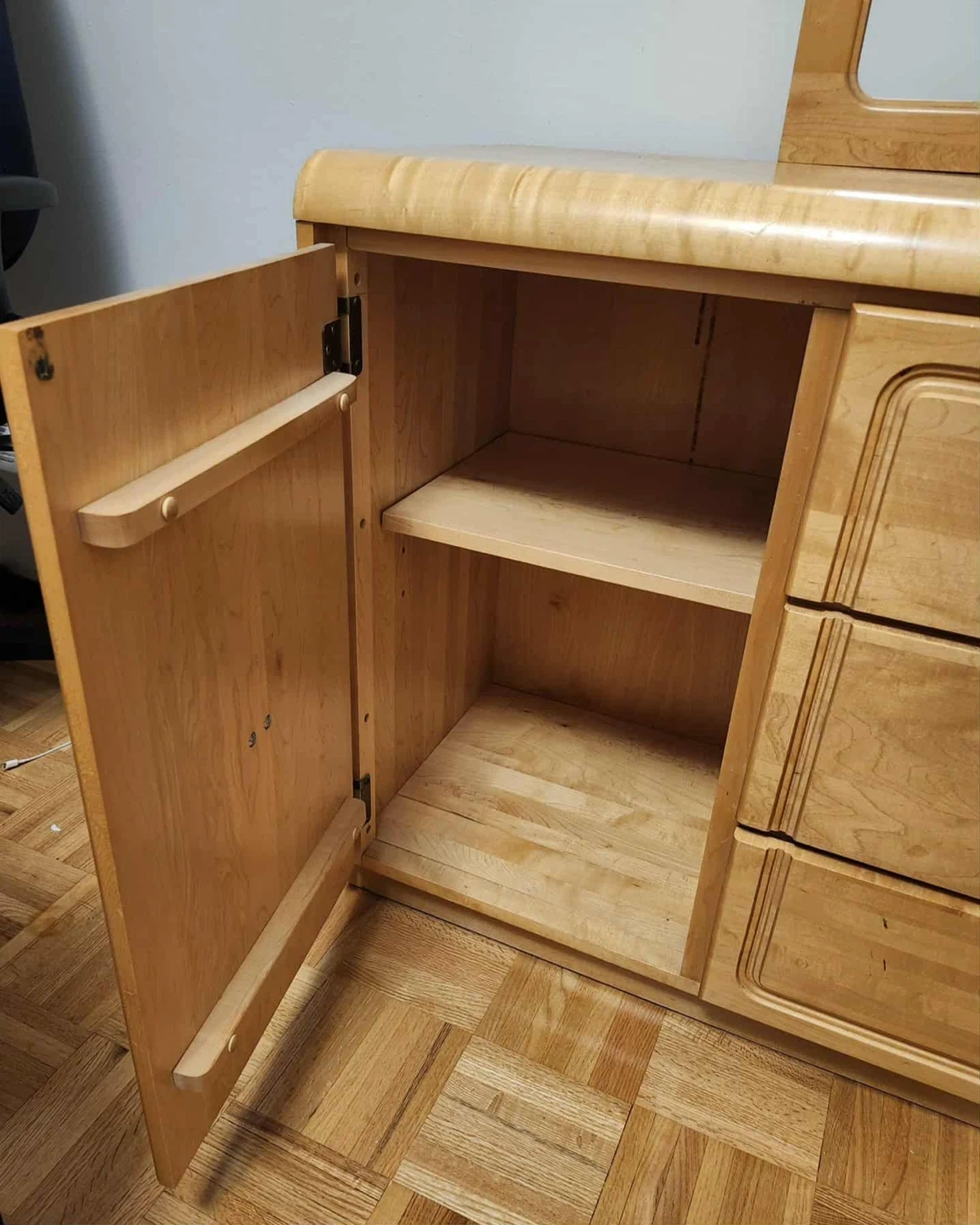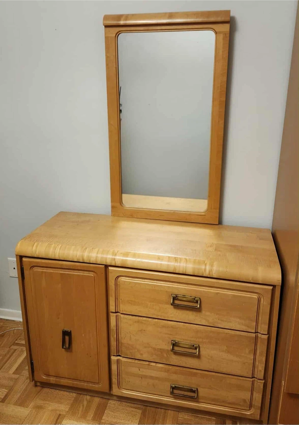 Selling a lovely wooden dresser with a matching mirror and two nightstands. This set would be a great addition to any bedroom. The dresser features a cabinet and three drawers, providing ample storage space. The nightstands each have two drawers. Light wood colour to fit any decor. All pieces are in very good condition and ready for a new home.