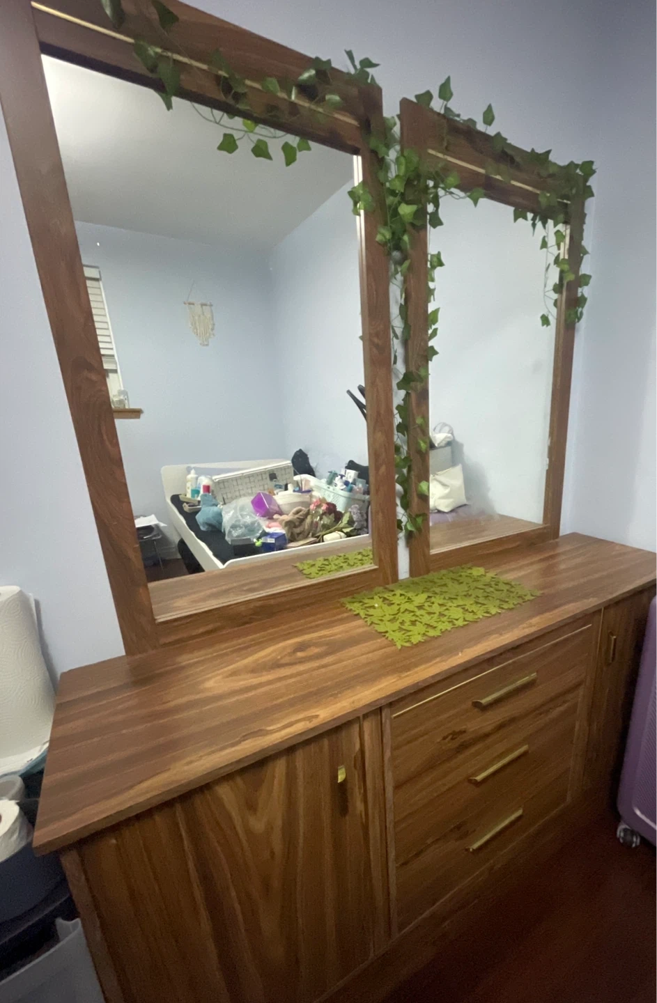 Selling a lovely wooden dresser with a mirror. It's in great shape and would look fantastic in any bedroom. The dresser features drawers and a cabinet for ample storage space. Perfect for organizing your clothes and accessories!