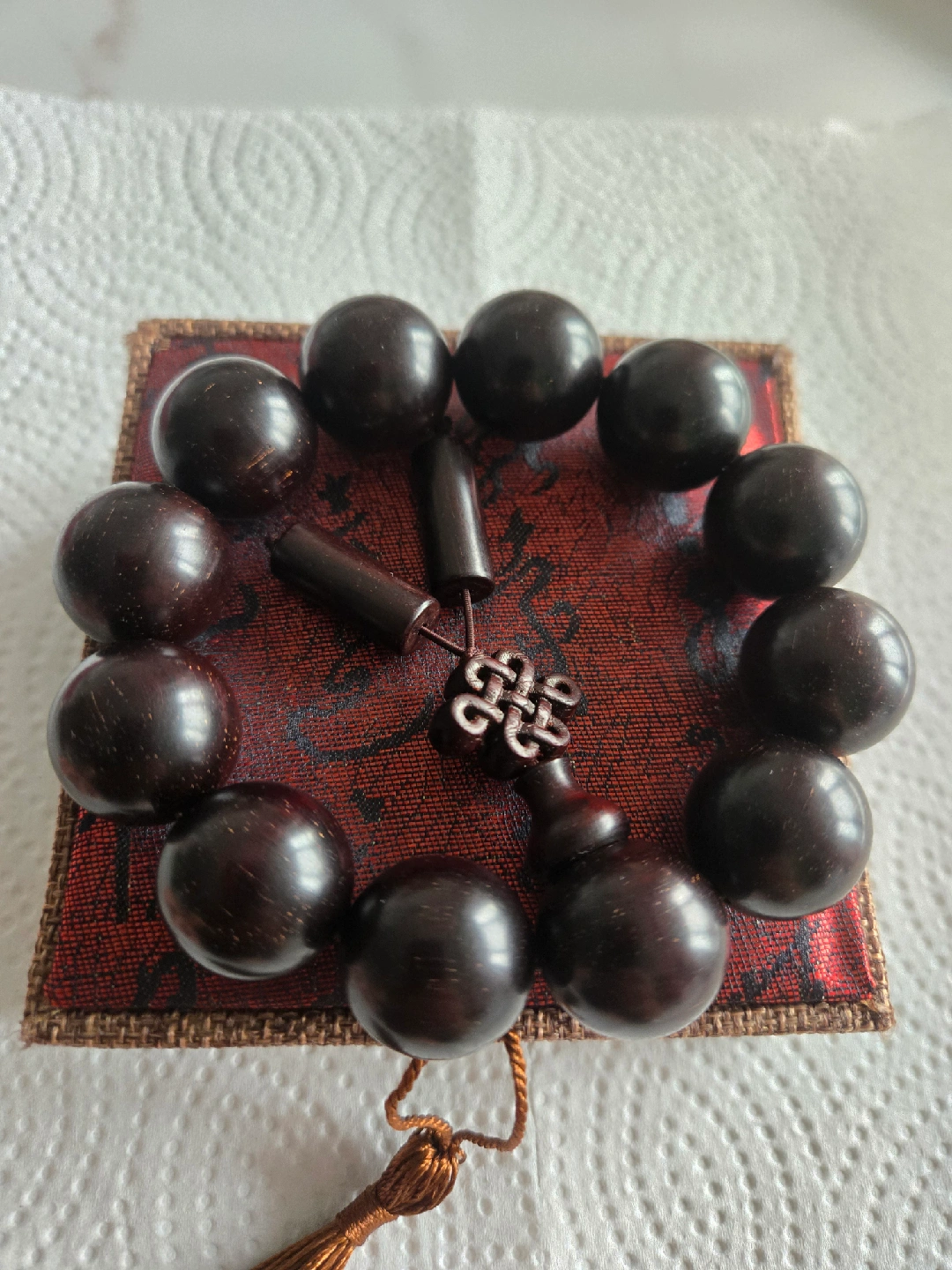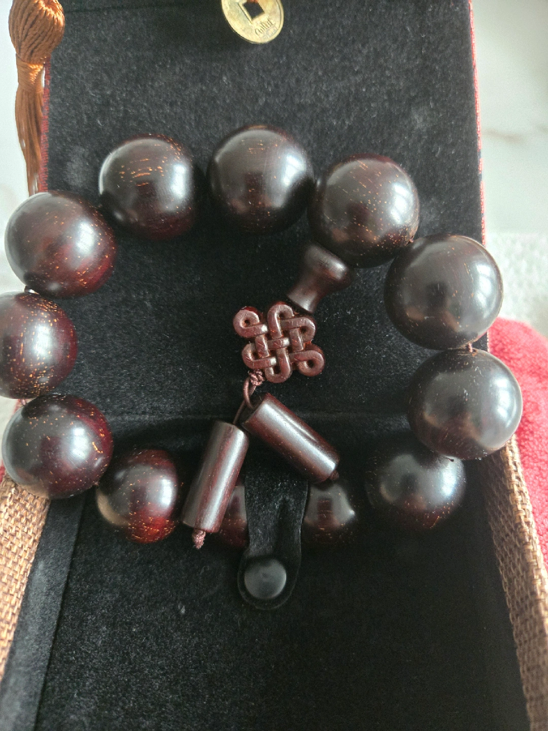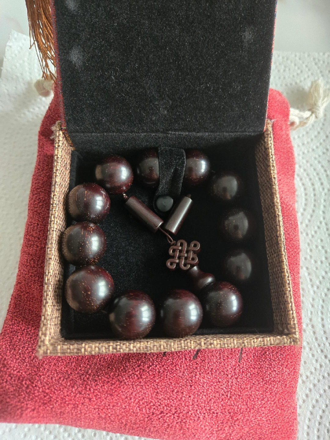 Here's a beautiful wooden bead bracelet! It comes with its original box, making it perfect for gifting or keeping it safe when you're not wearing it. The dark wood has a lovely, natural look.