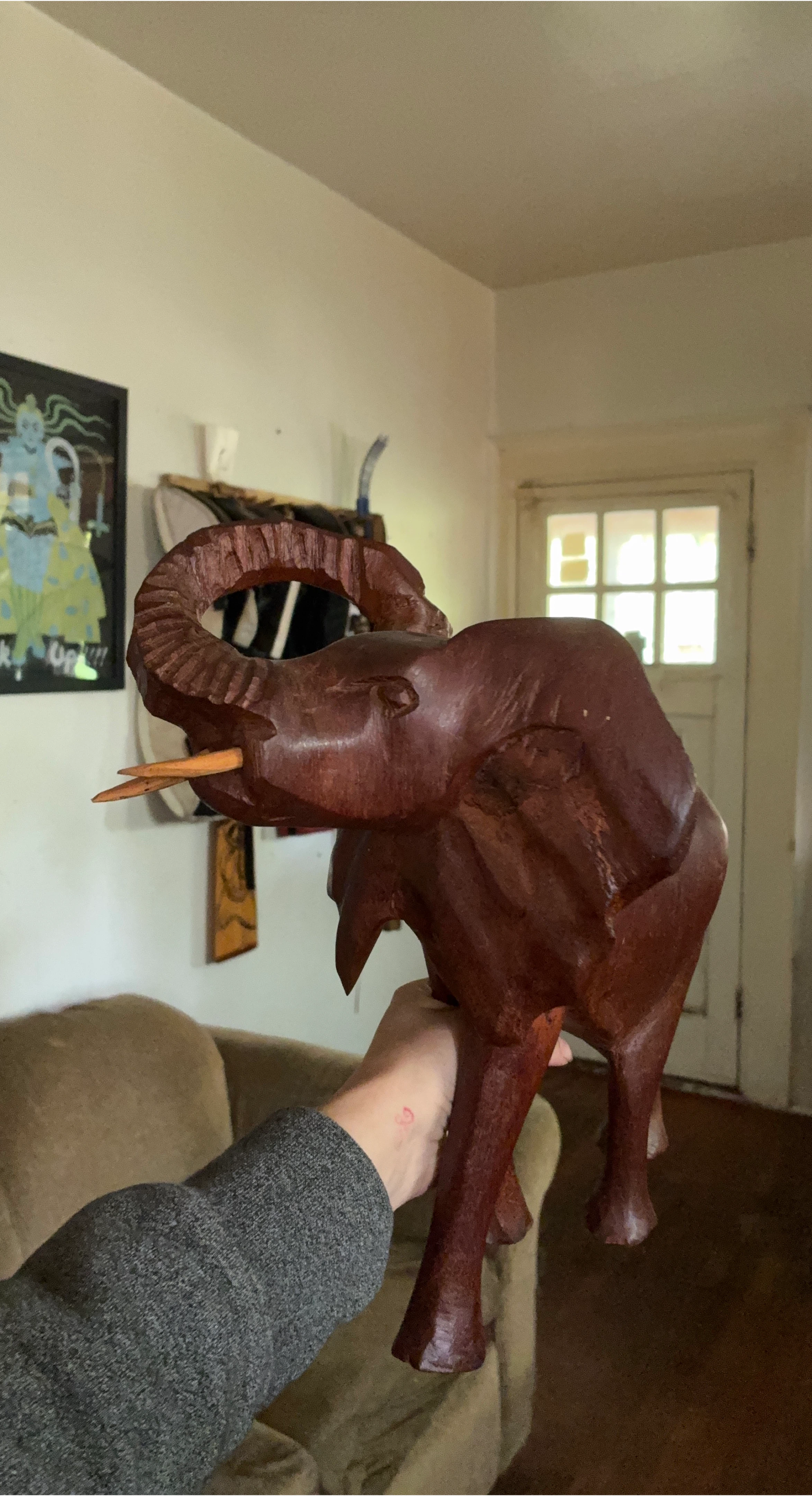 Here's a lovely wooden elephant carving! It's a unique piece that would look great as a decorative item in your home. The carving is in good condition and has a beautiful, natural finish
