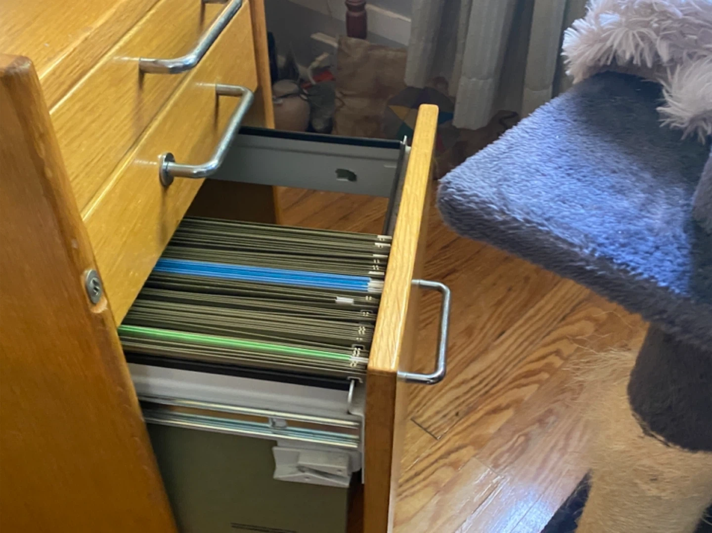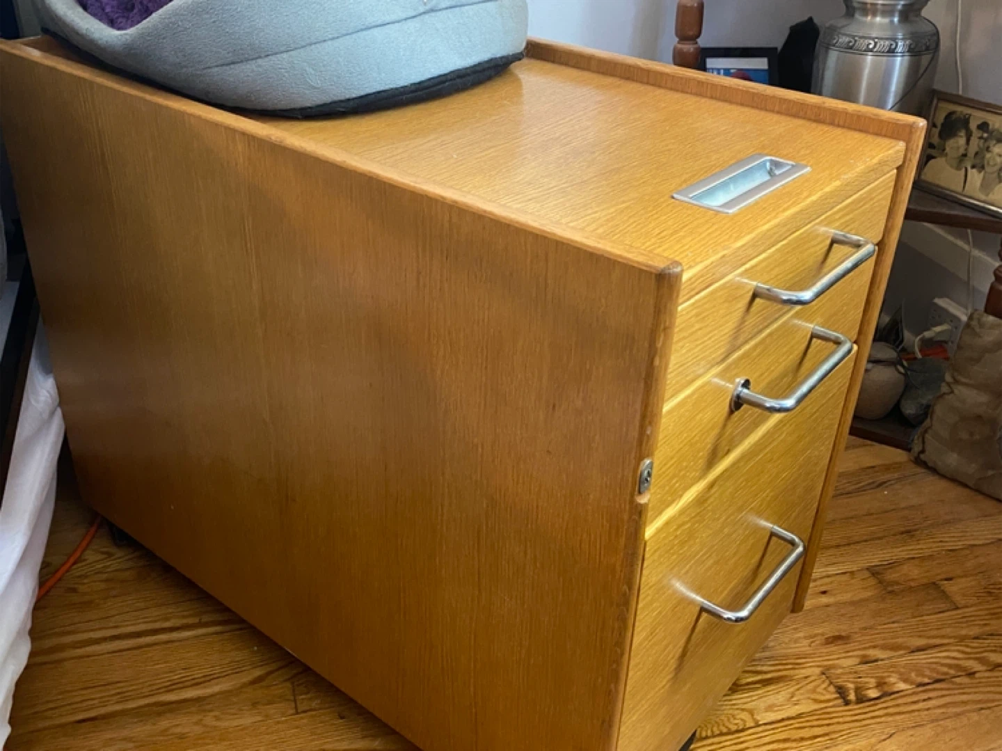 97Here's a wooden filing cabinet in good condition. It has three drawers and silver handles and is on wheels. Perfect for keeping your documents organized! Will be put out for garbage pickup Wednesday the 8th