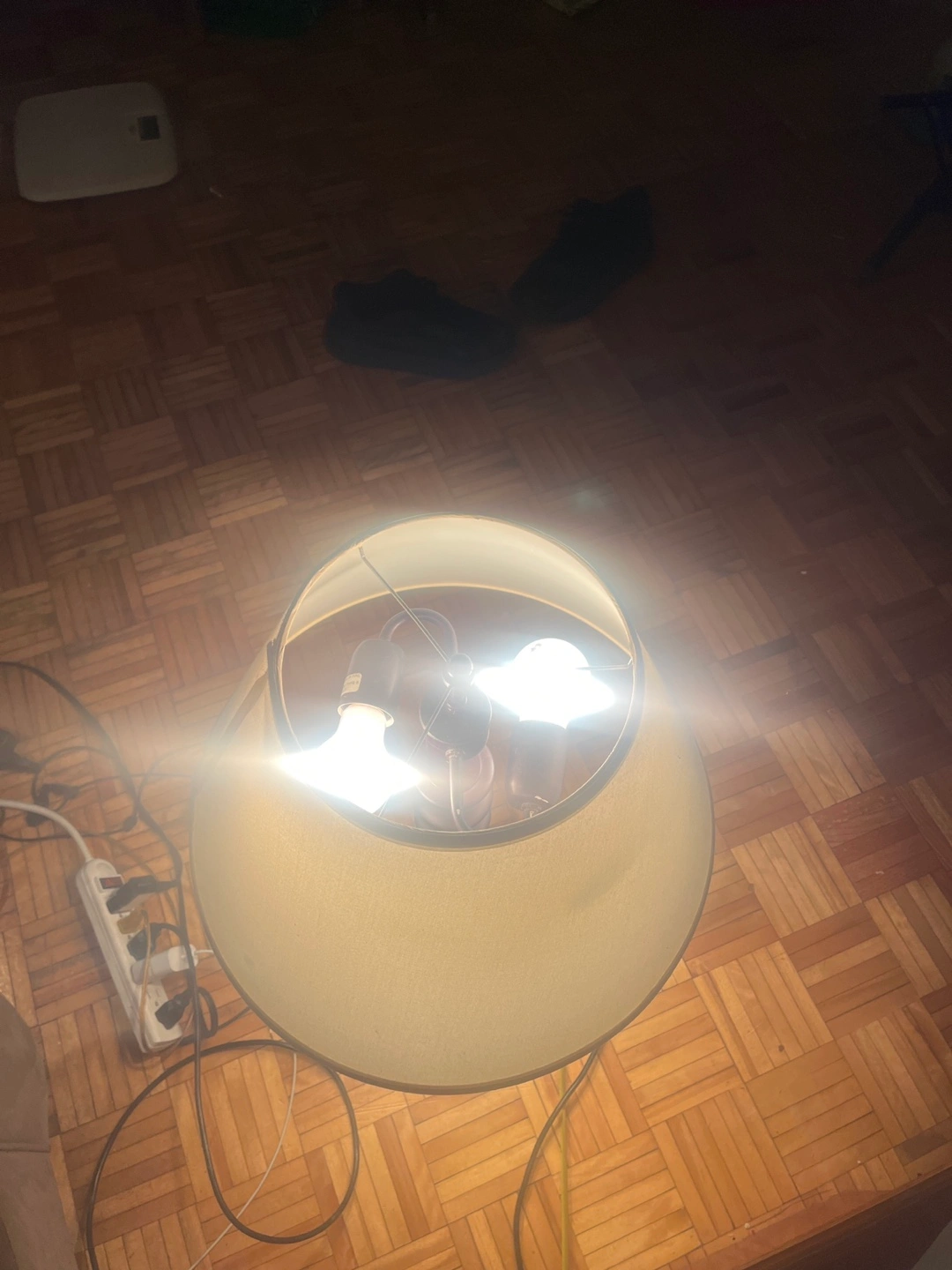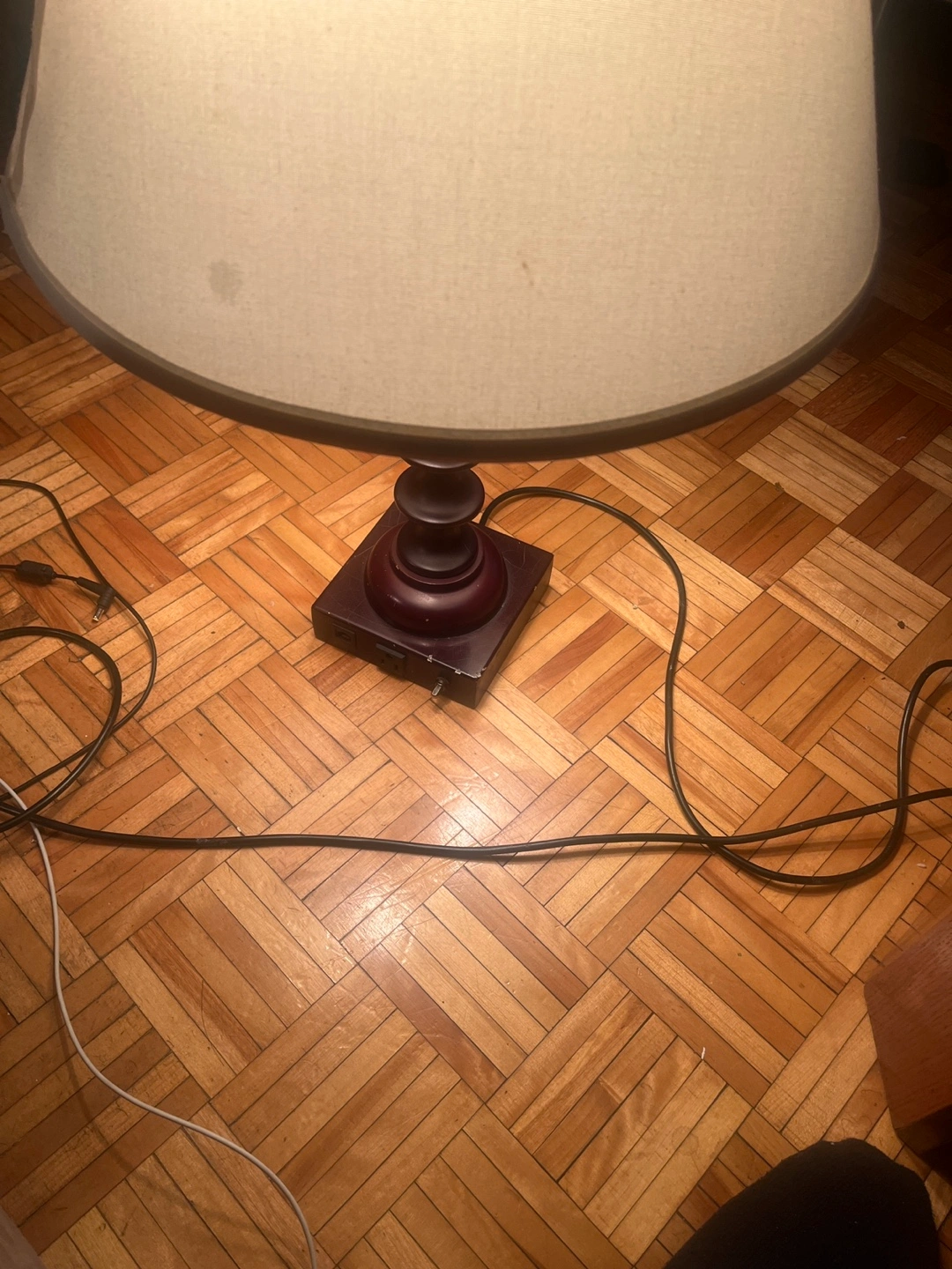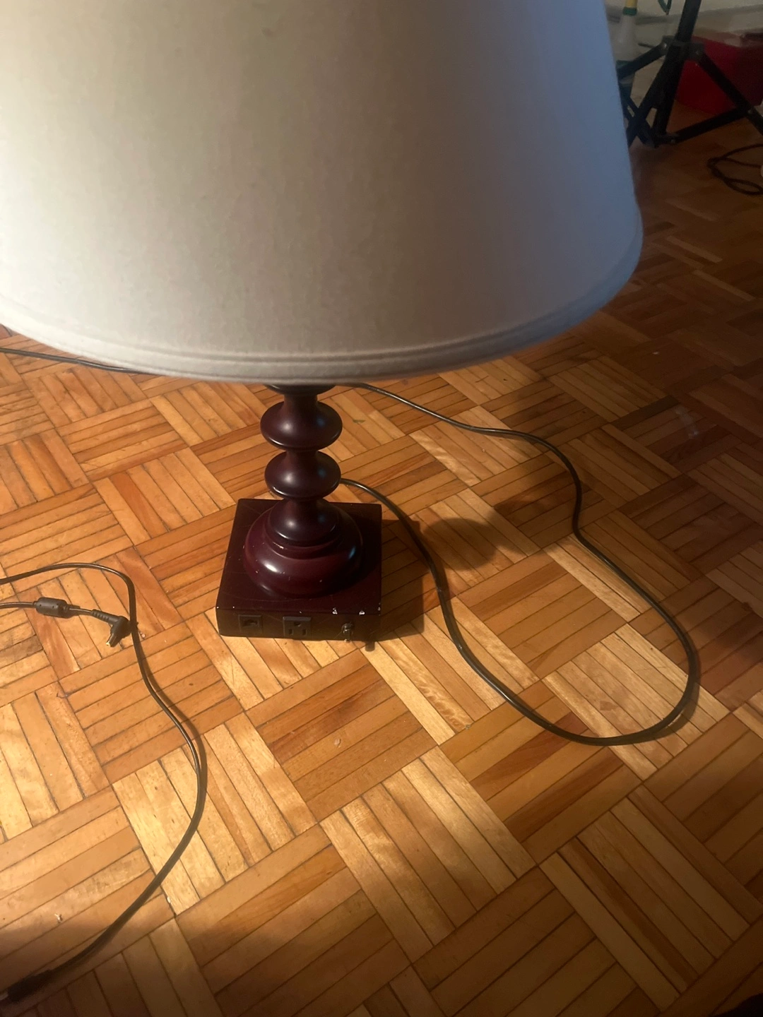 63Dark brown wooden floor lamp with a white lampshade. The lamp has a square base with a cord that plugs into an outlet.