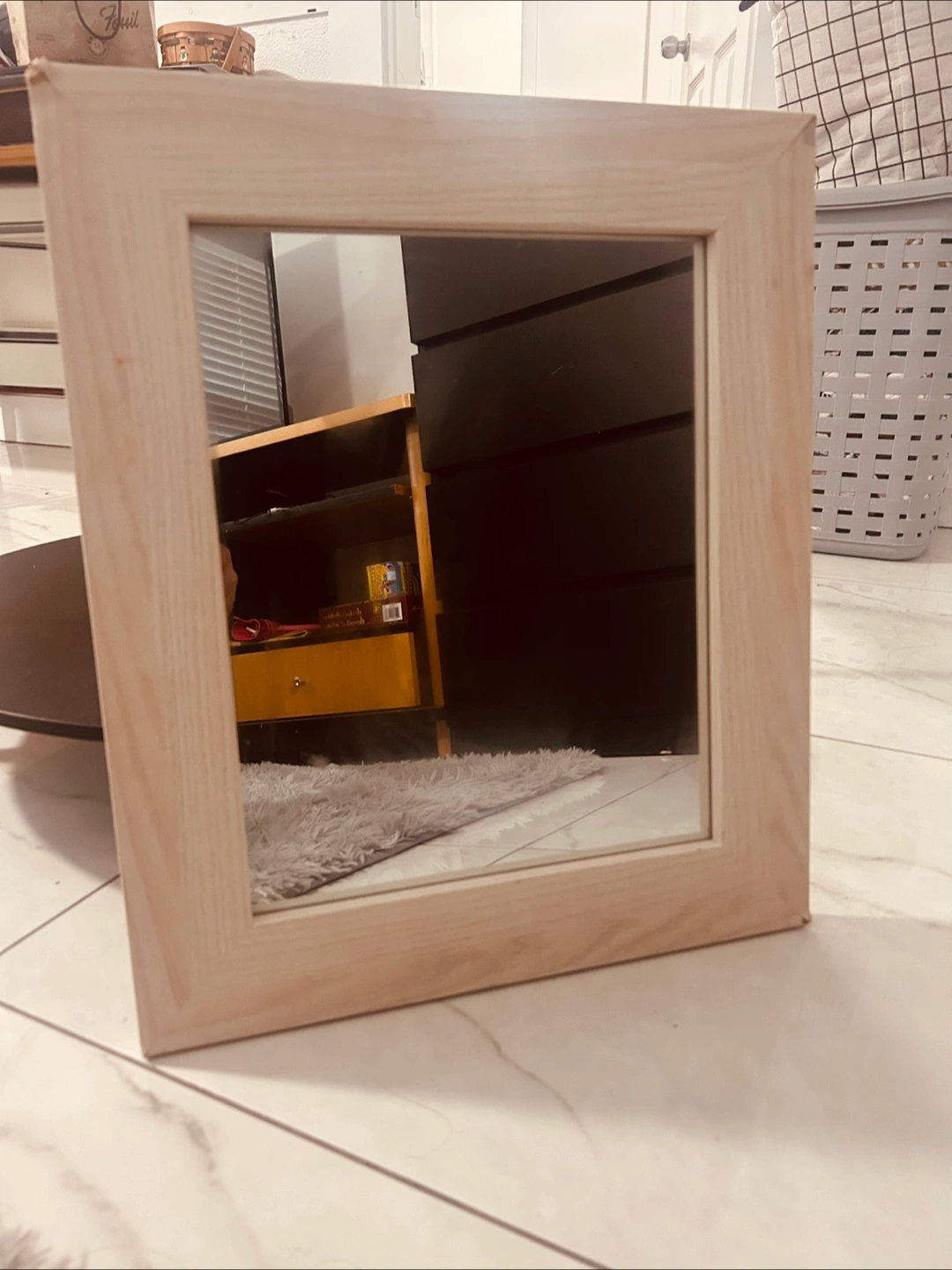 29Square mirror with a light wood frame. The frame has a simple design. A great tool to help you check your outfit of the day.