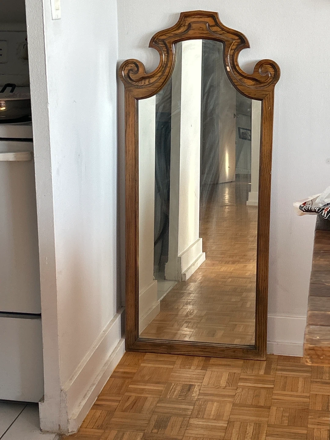 A lovely wooden framed mirror, perfect for adding a touch of elegance to any room! The frame has a beautiful design with decorative flourishes at the top. It’s in great condition and ready to brighten up your space