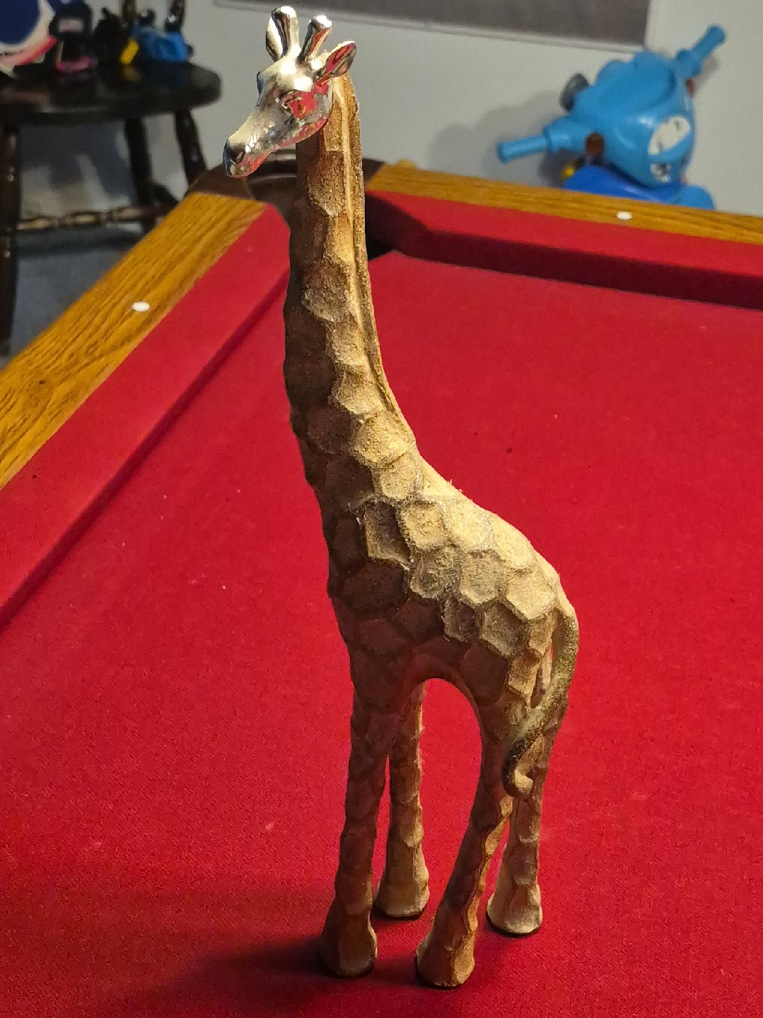 15Selling a charming wooden giraffe figurine! It has a silver-coloured head and a unique textured body. It's a lovely decorative piece for any room