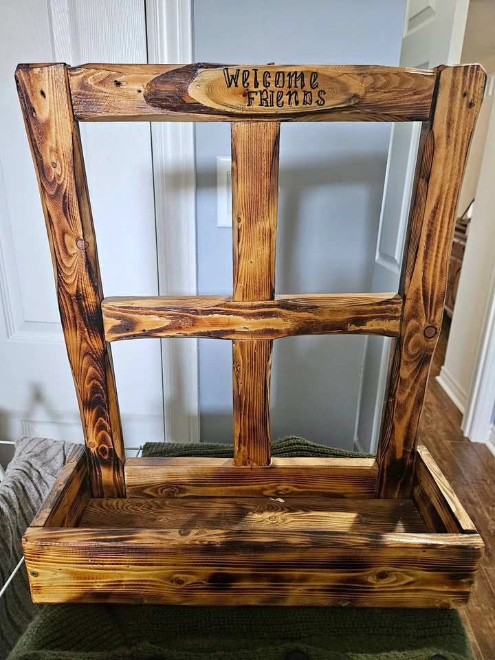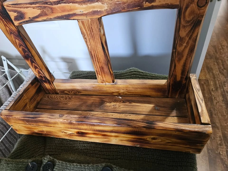 Wooden holder with storage area. Solid wood design. Can we hung on a wall. Can be used to place keys and other items