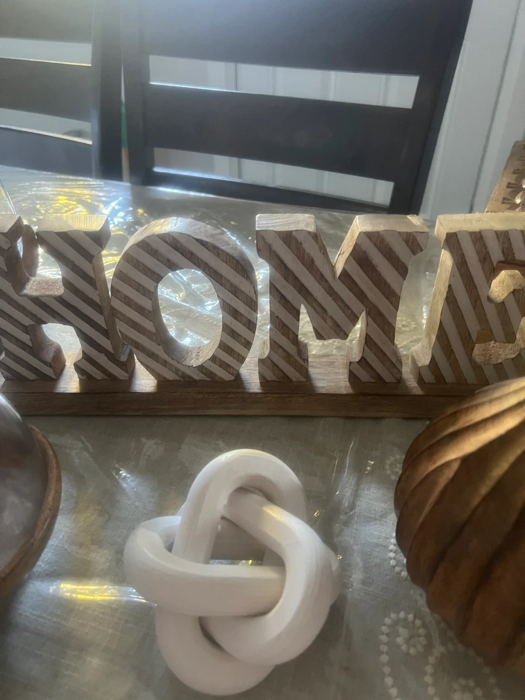 40Selling a collection of wooden home decor items! Includes a 'HOME' sign, a decorative knot, a carved wooden vase, a glass cloche with a wooden base, and a carved wooden box. All items are in good condition and would add a nice touch to any room