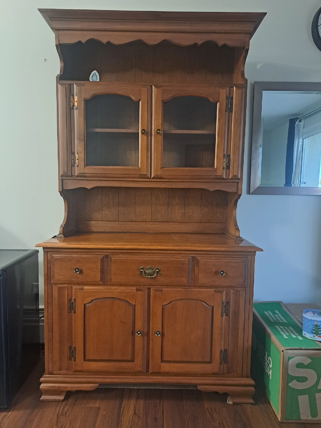 I'm giving away a charming wooden hutch, perfect for adding a touch of rustic elegance to your dining area or kitchen. Also available is a Silhouette mini fridge, ideal for a dorm room or small space. Both pieces are in good condition and ready for a new home! Also, a maple side table.