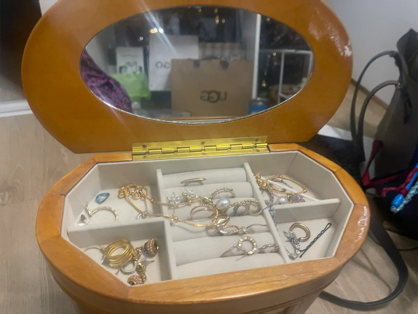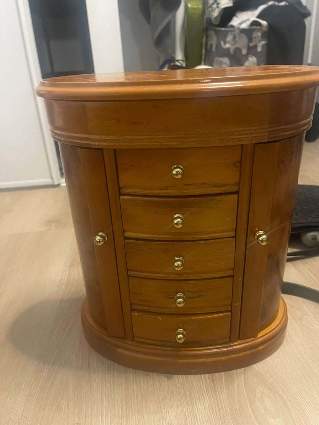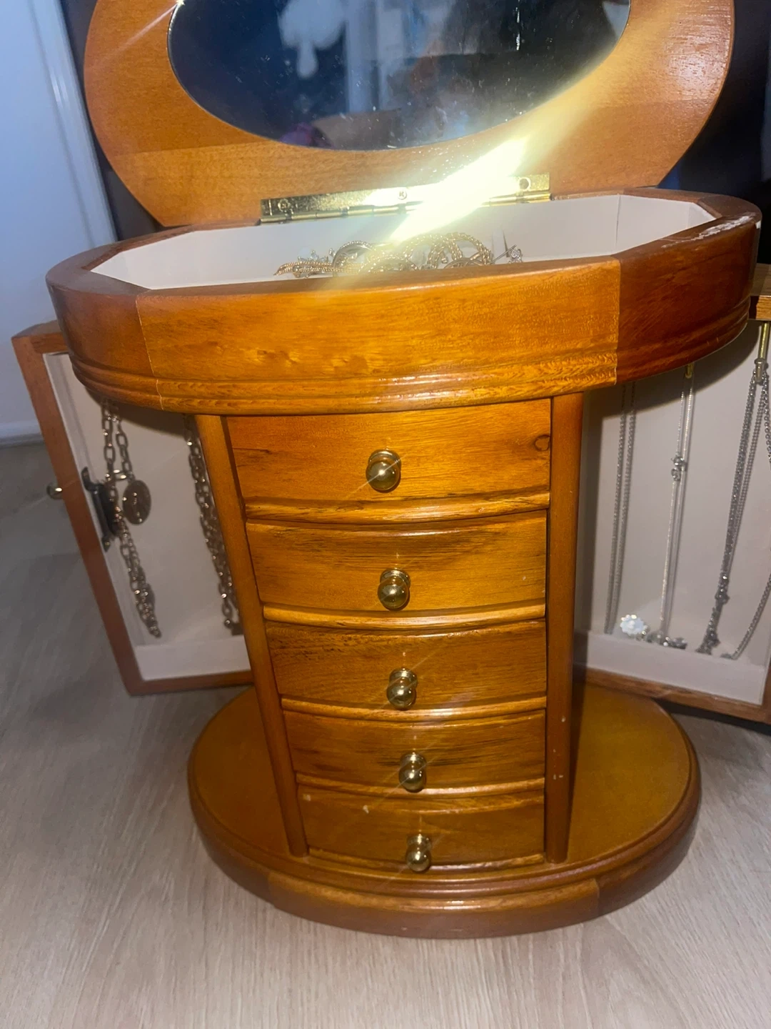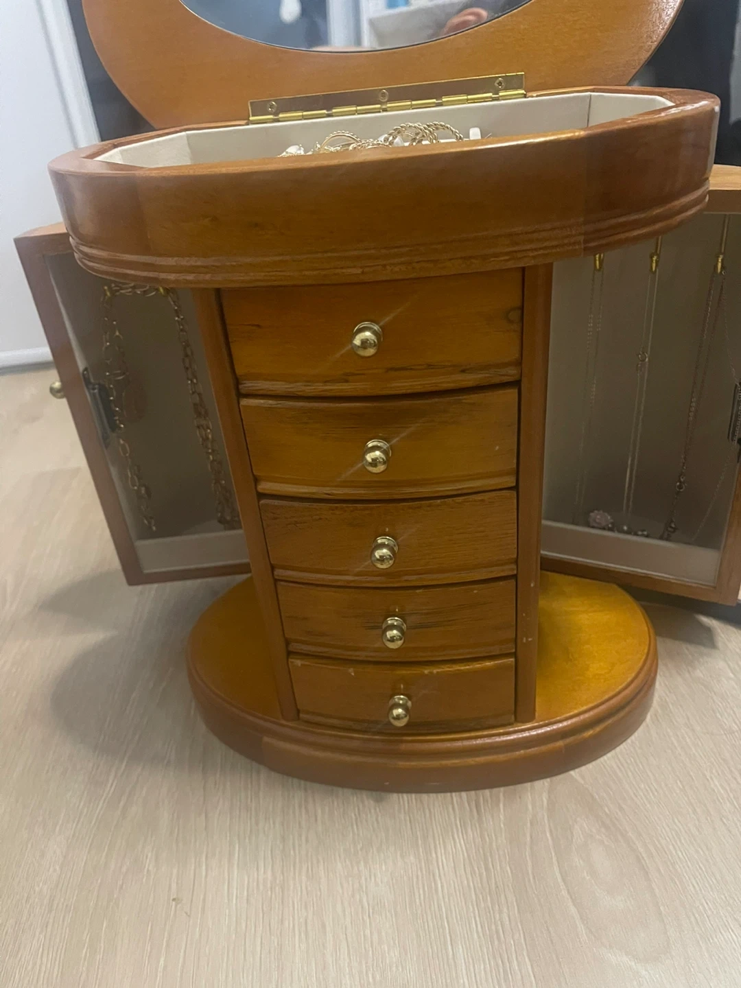 Selling a lovely wooden jewelry box. It features a mirror on the inside of the lid and several drawers for storing all your rings, necklaces, and earrings. It’s perfect for keeping your jewelry organized and safe! Selling cause I dont have storage to keep it😭