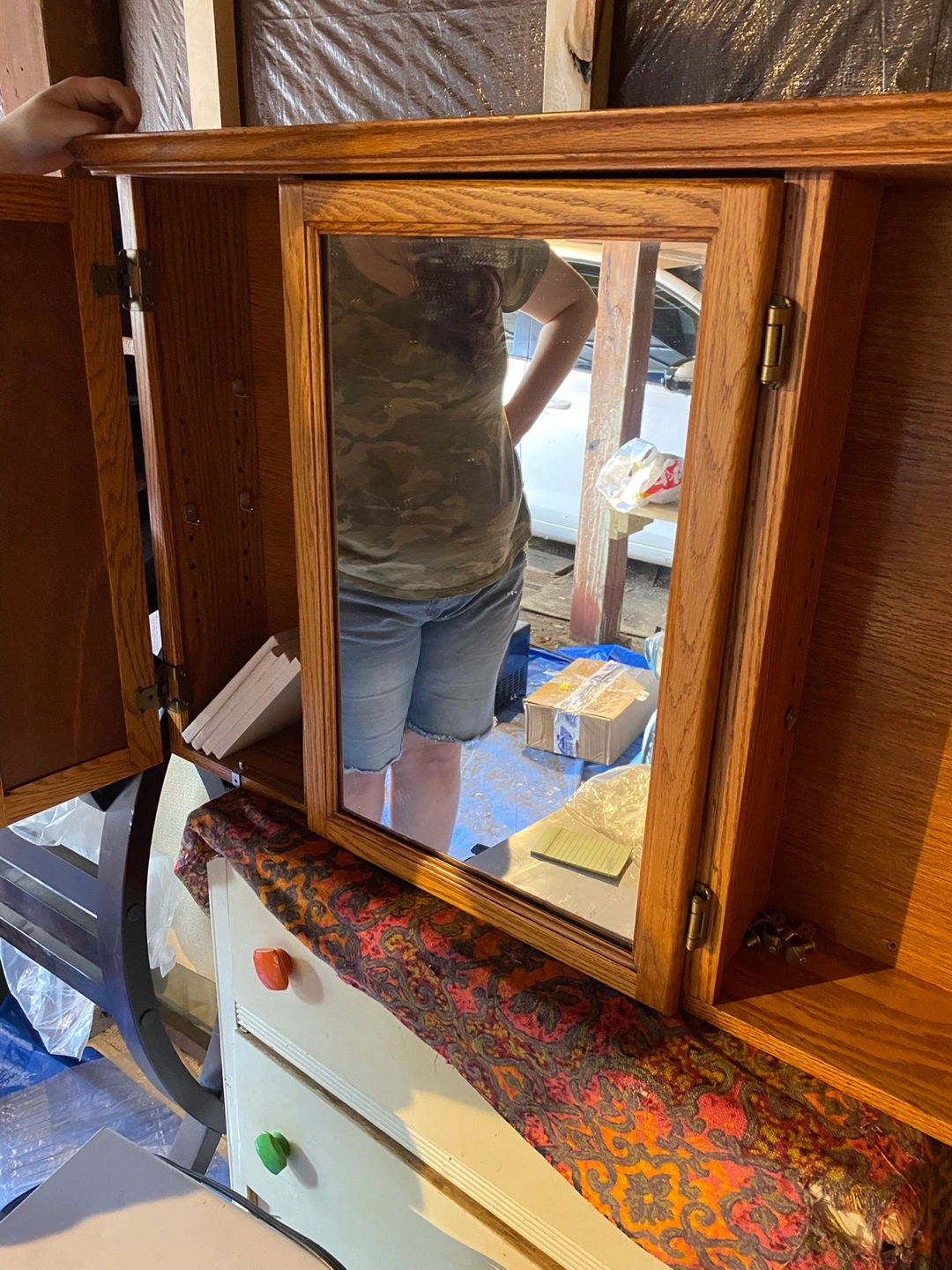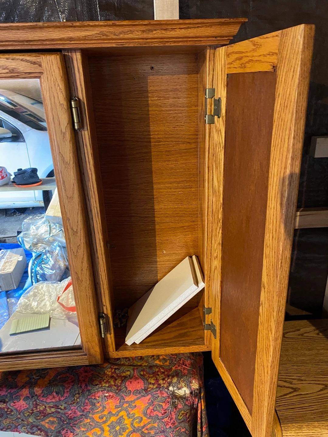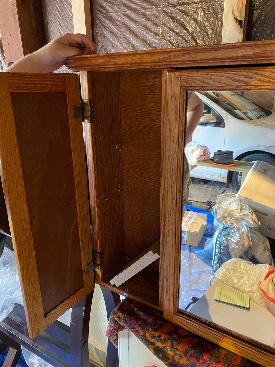 Here's a wooden medicine cabinet with a mirror. It has a classic look and would be great for adding some storage to your bathroom or top of a low dresser ….. even on a countertop in the kitchen for spices for example , or any other room in the house, adjustable shelves, 38”W x 24”H x 7” D (96.5x61x17.5 cm) It’s brand new, never used….it’s too wide for my countertop in the kitchen…. And too large for my bathroom. Moving Sale Pick up only