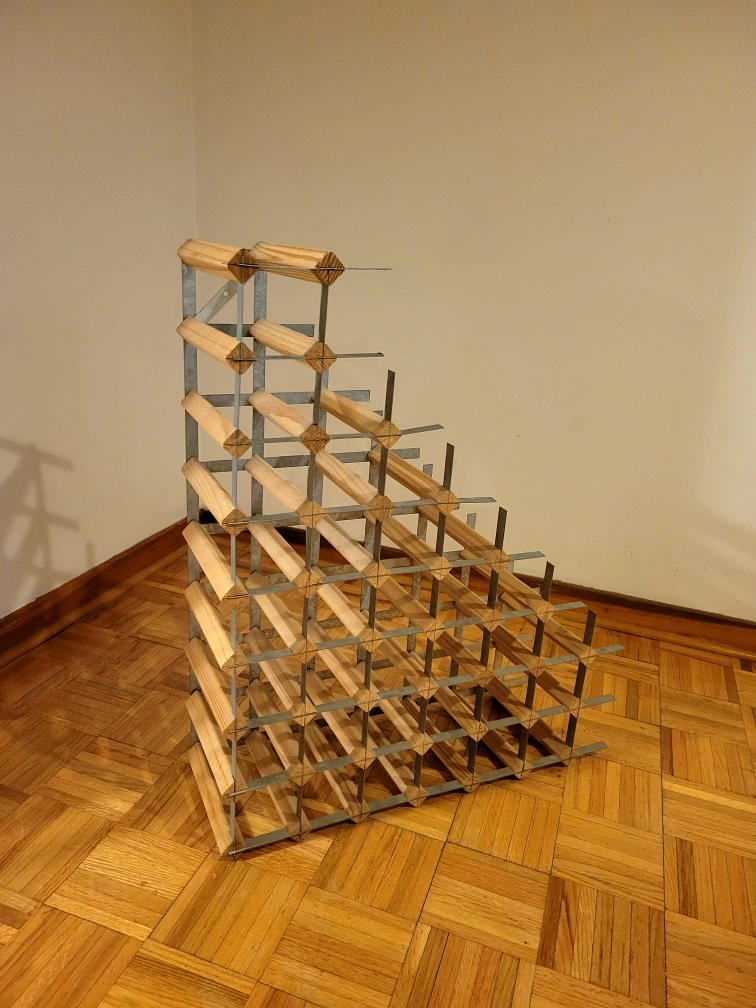 179Here's a sturdy wine rack ready for a new home! It's made of wood and metal, perfect for storing your favourite bottles in style