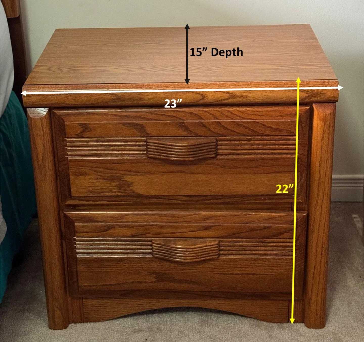 12Here's a wooden nightstand with two drawers. It's a warm, classic piece perfect for adding a touch of functionality to your bedroom. Dimensions: - Depth: 15 inches - Width: 23 inches - Height: 22 inches