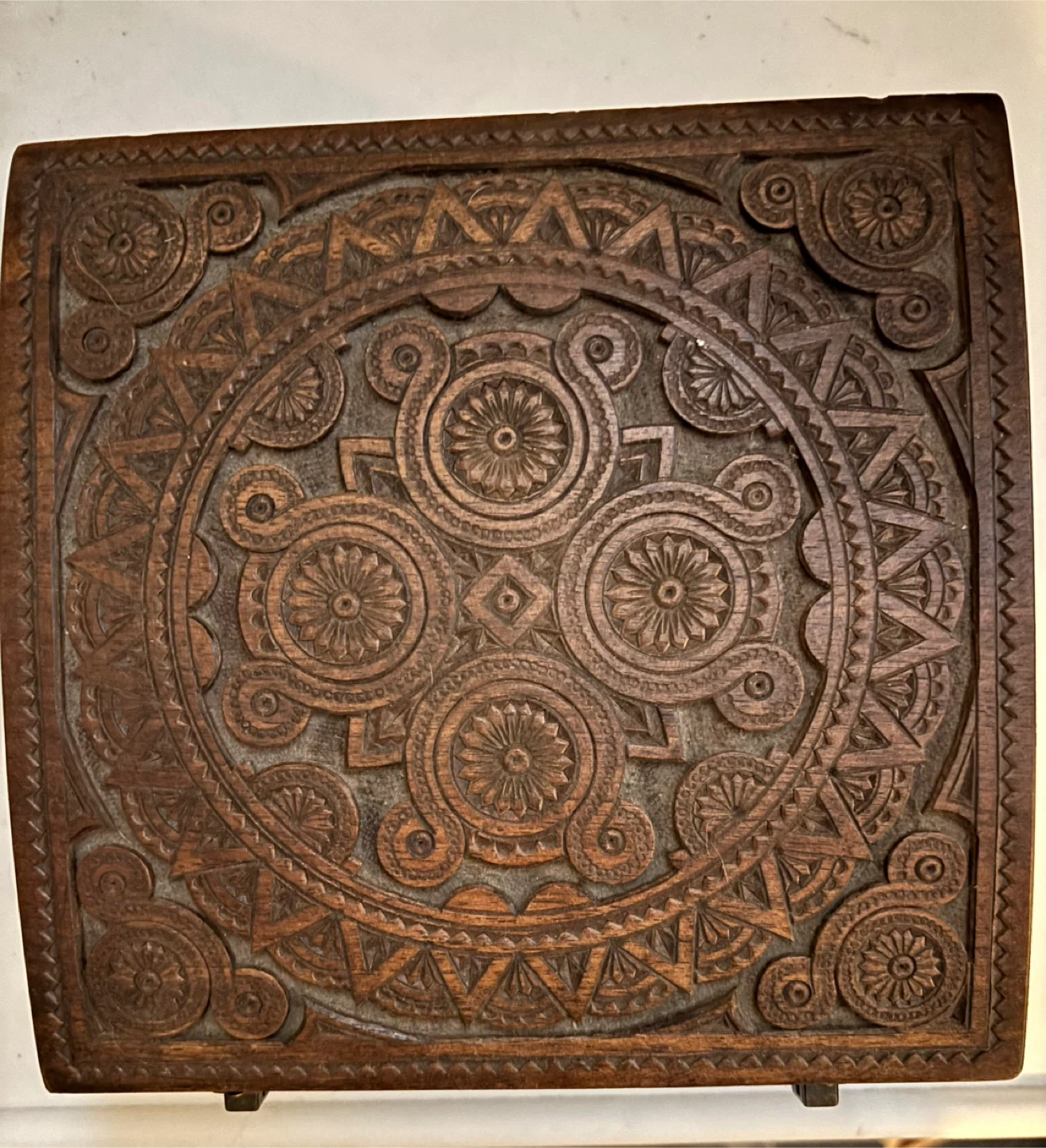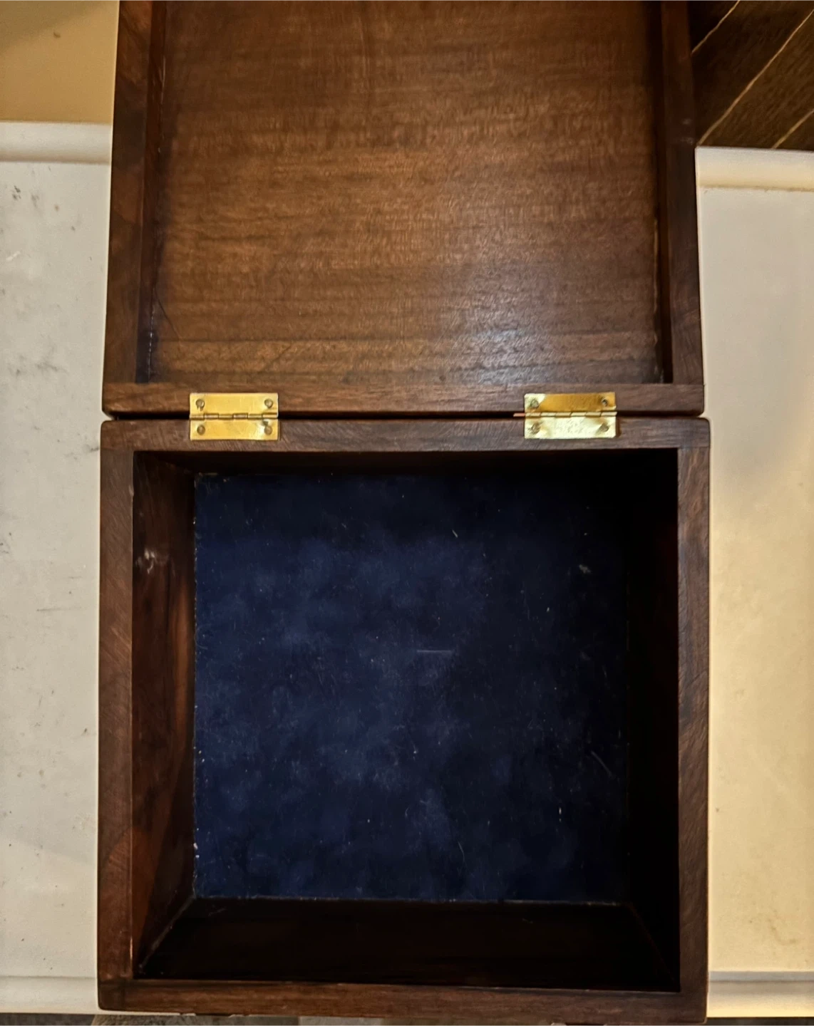 Selling a lovely wooden decorative box. It features a detailed, carved design on the lid and a soft, felt-lined interior. Perfect for storing small treasures or adding a touch of rustic charm to your space