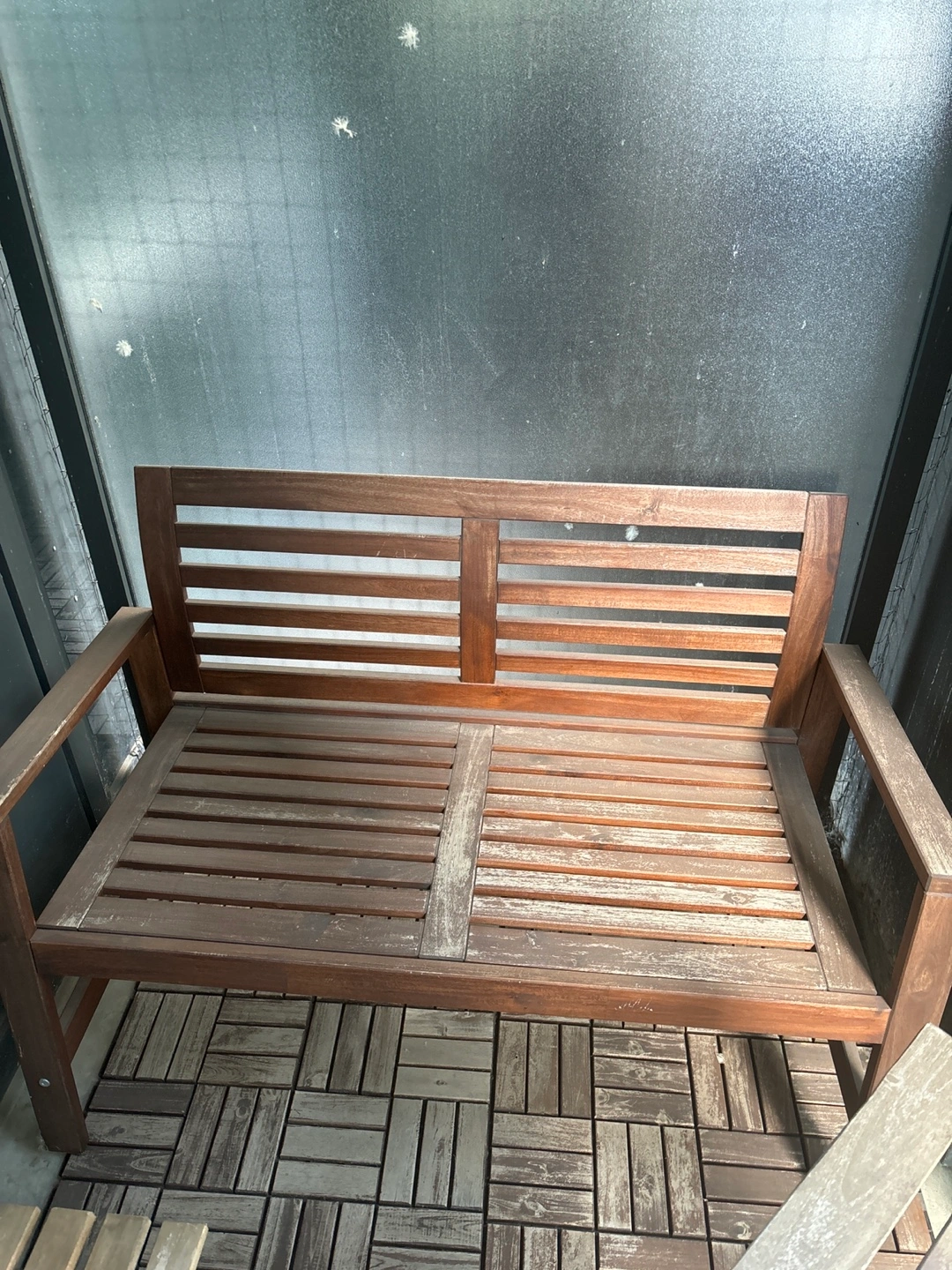43Wooden bench with slatted back and seat. Suitable for outdoor use.